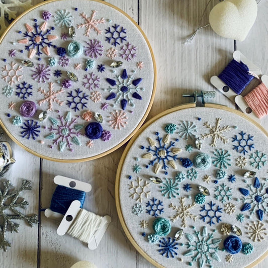 Full embroidery kit. Snowflake DIY modern hoop art. Creative winter craft gift for adult mindfulness.