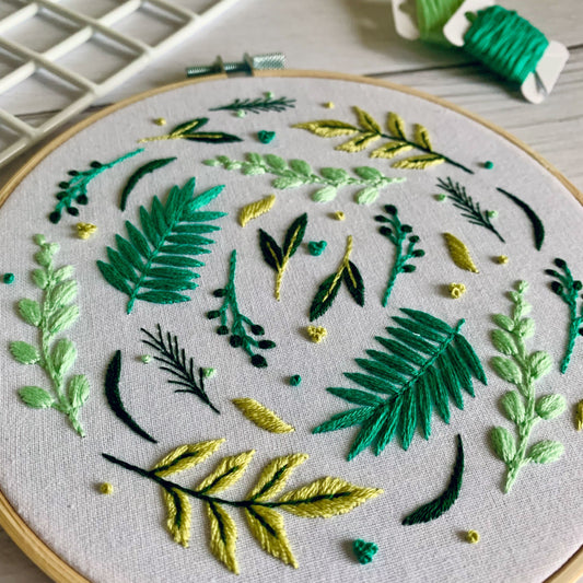 Full embroidery kit. Foliage DIY beginner hoop art craft. Adult anxiety/stress relief plants and leaves gift