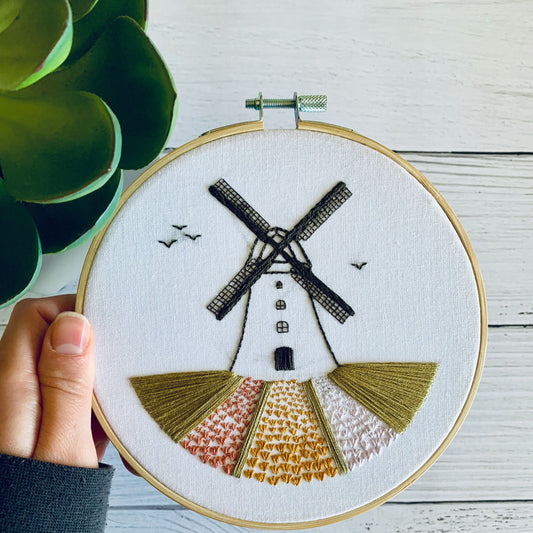 Full embroidery kit. Windmill and flowers DIY beginner hoop art craft. Adult anxiety/stress relief holland dutch tulip fields gift