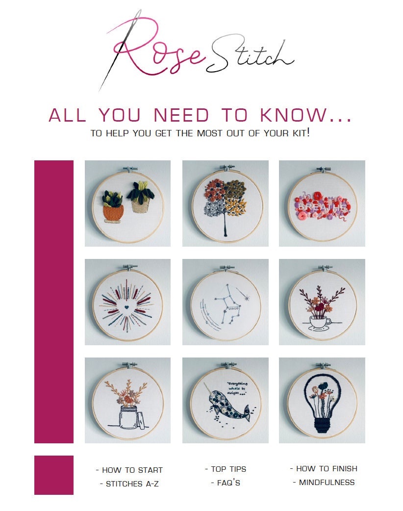 - A full digital instruction booklet inc. starting + finishing advice, stitch guide, colour guide, stitches how to step-by-step, top tips and FAQ's.