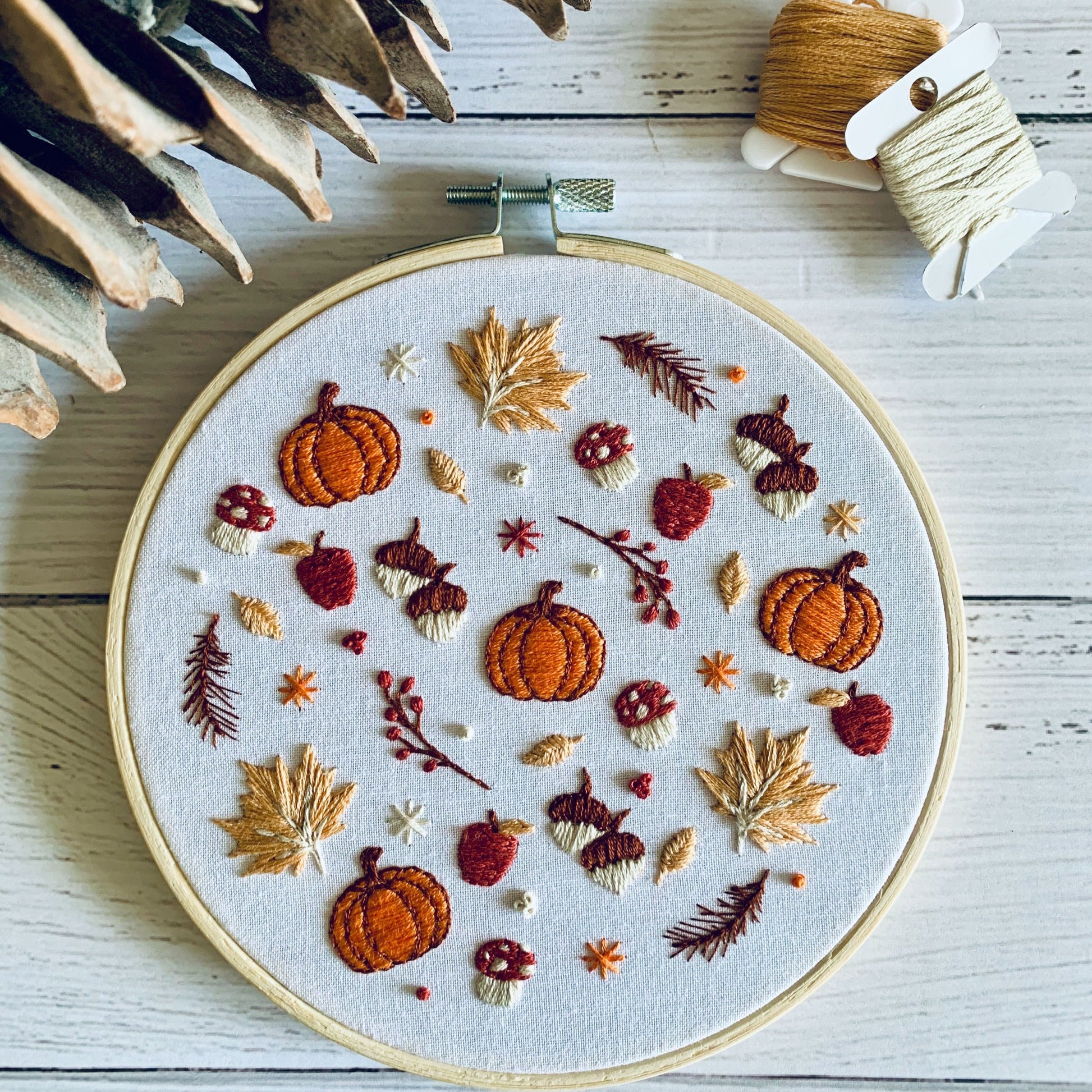 Digital download. Autumnal fall embroidery hoop art PDF pattern with instructions. Mushroom woodland beginner crewel wall decor project
