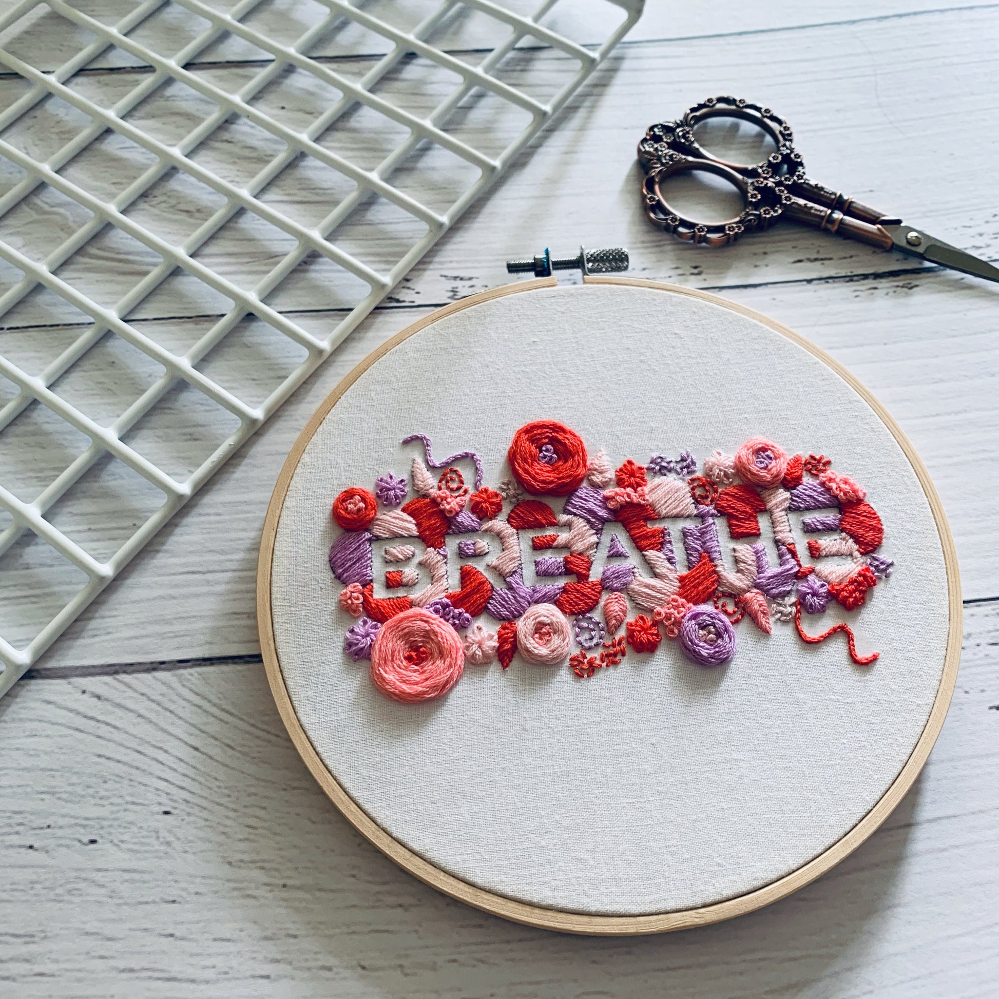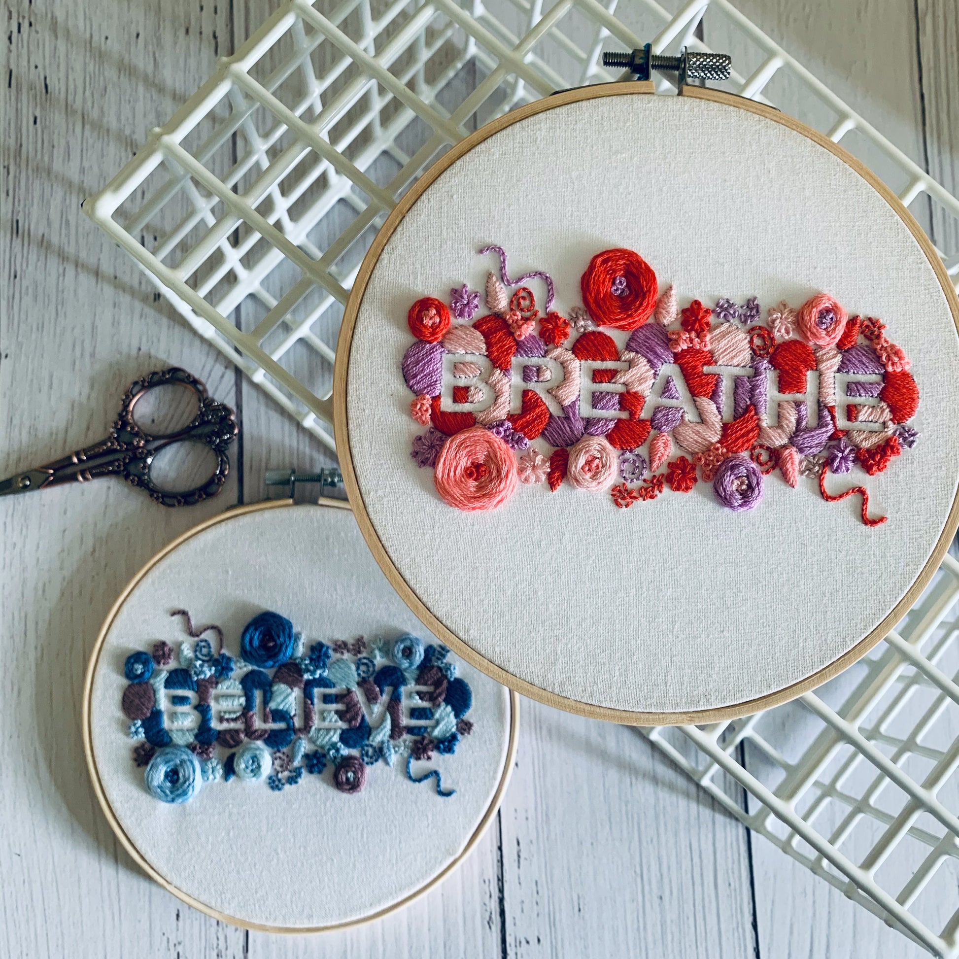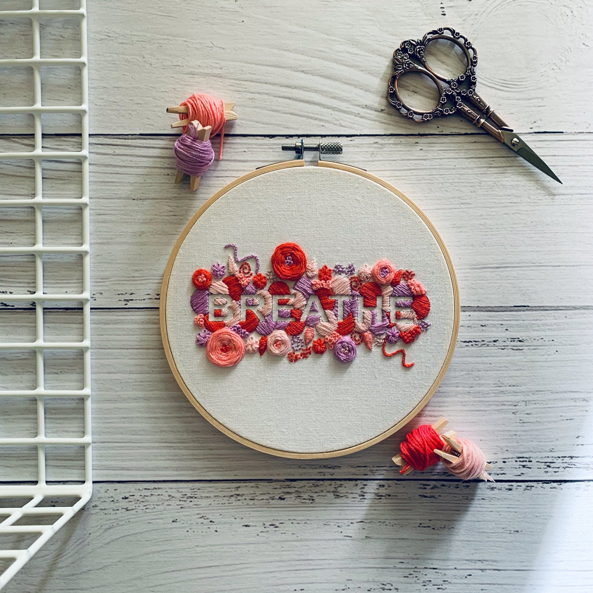 Digital download. Breathe embroidery hoop art PDF pattern with instruction booklet. Positive word hand sewing design.