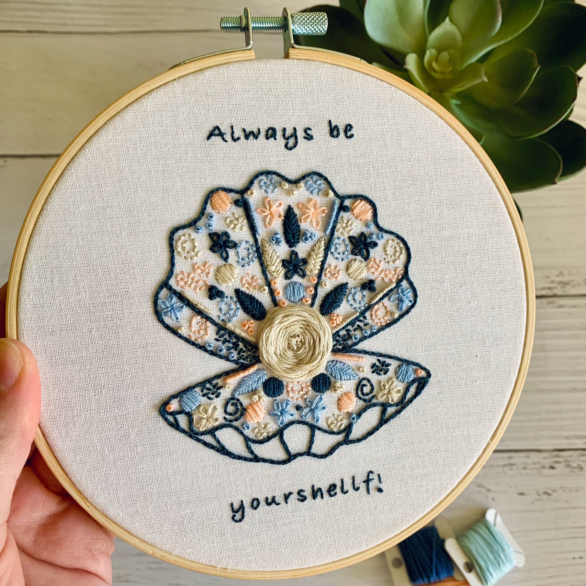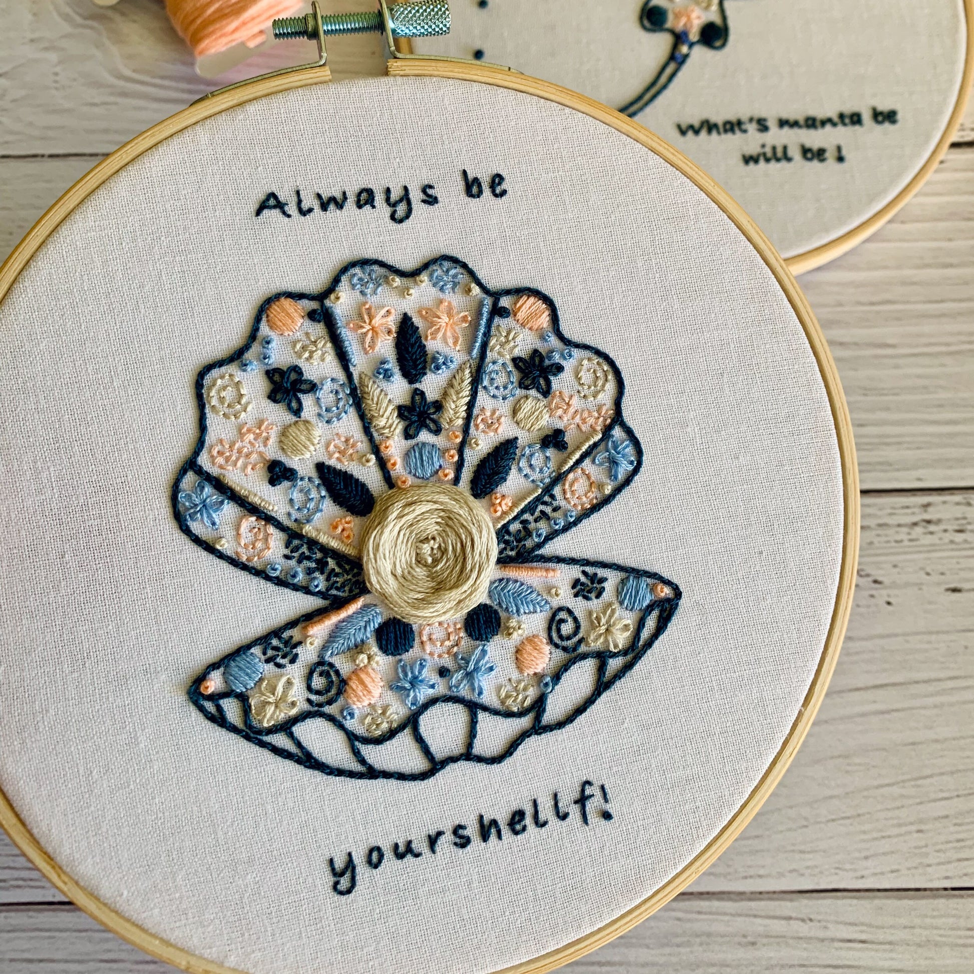 Digital download. Clam and pearl embroidery hoop art PDF pattern with instructions. Oyster pun sea animal beginner crewel wall decor project