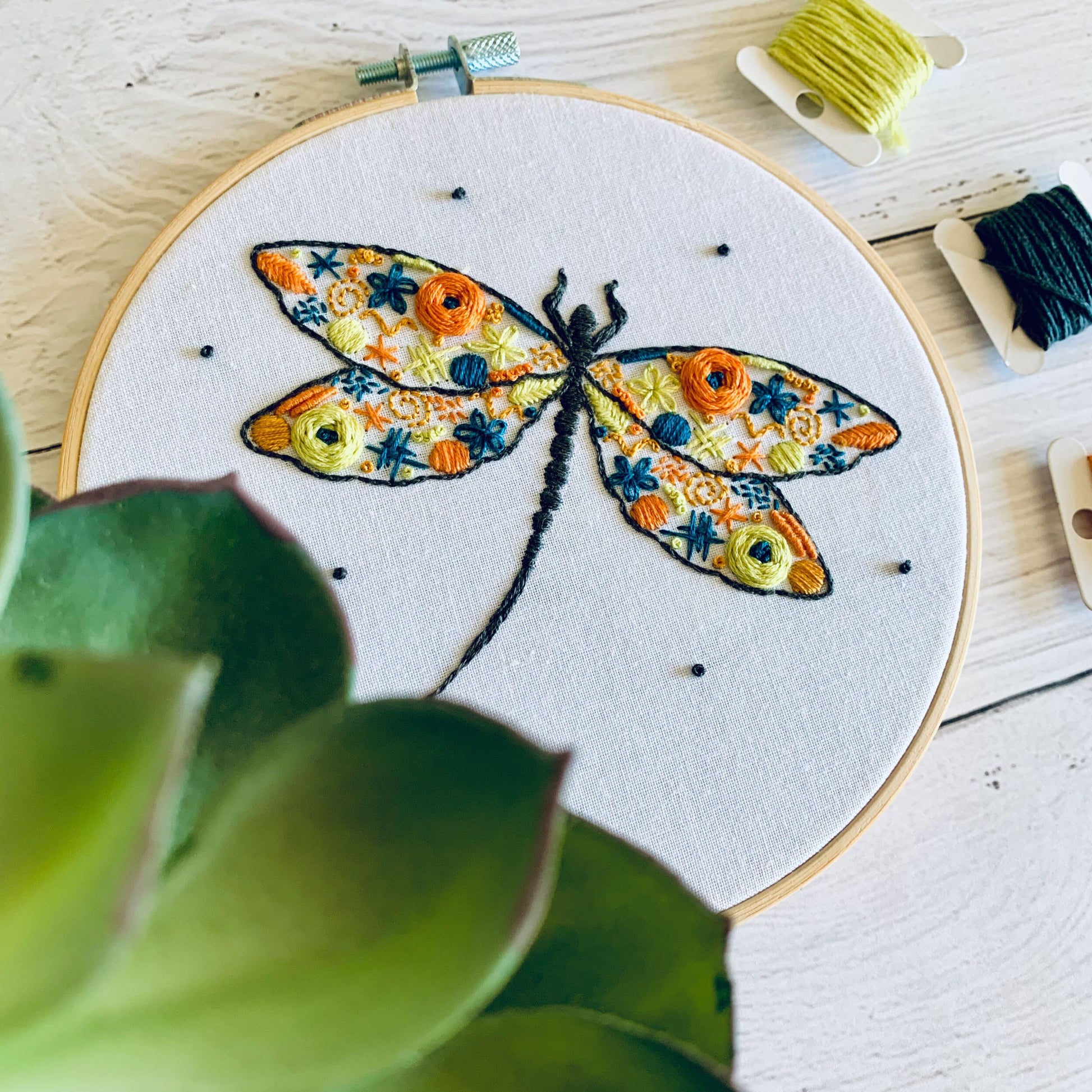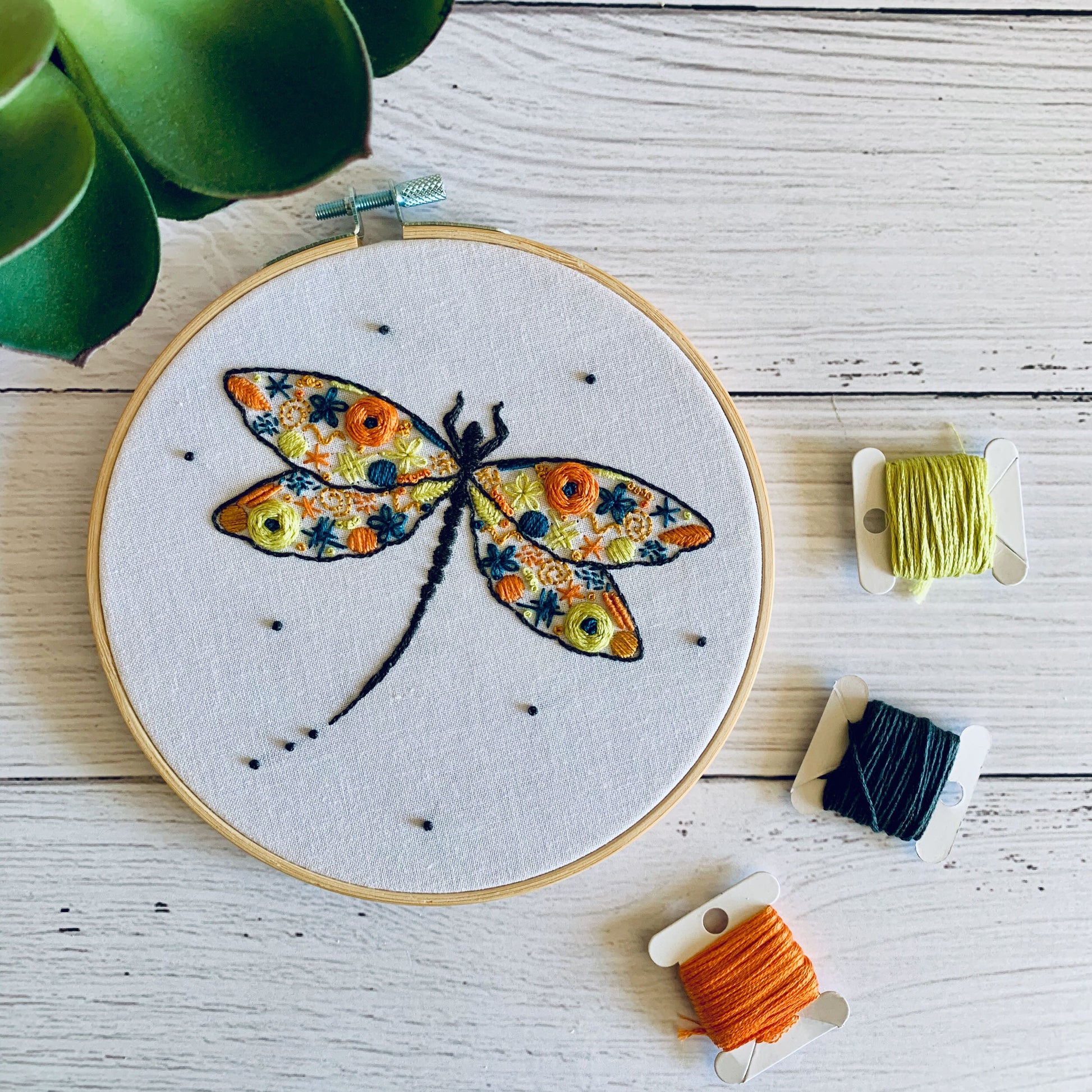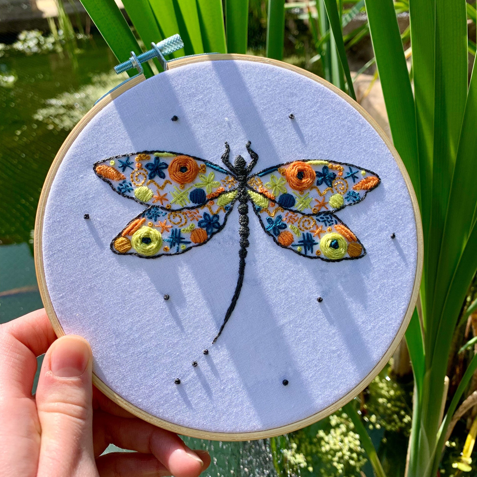 Digital download. Dragonfly embroidery hoop art PDF pattern with instructions. Inspirational wildlife beginner crewel wall decor project