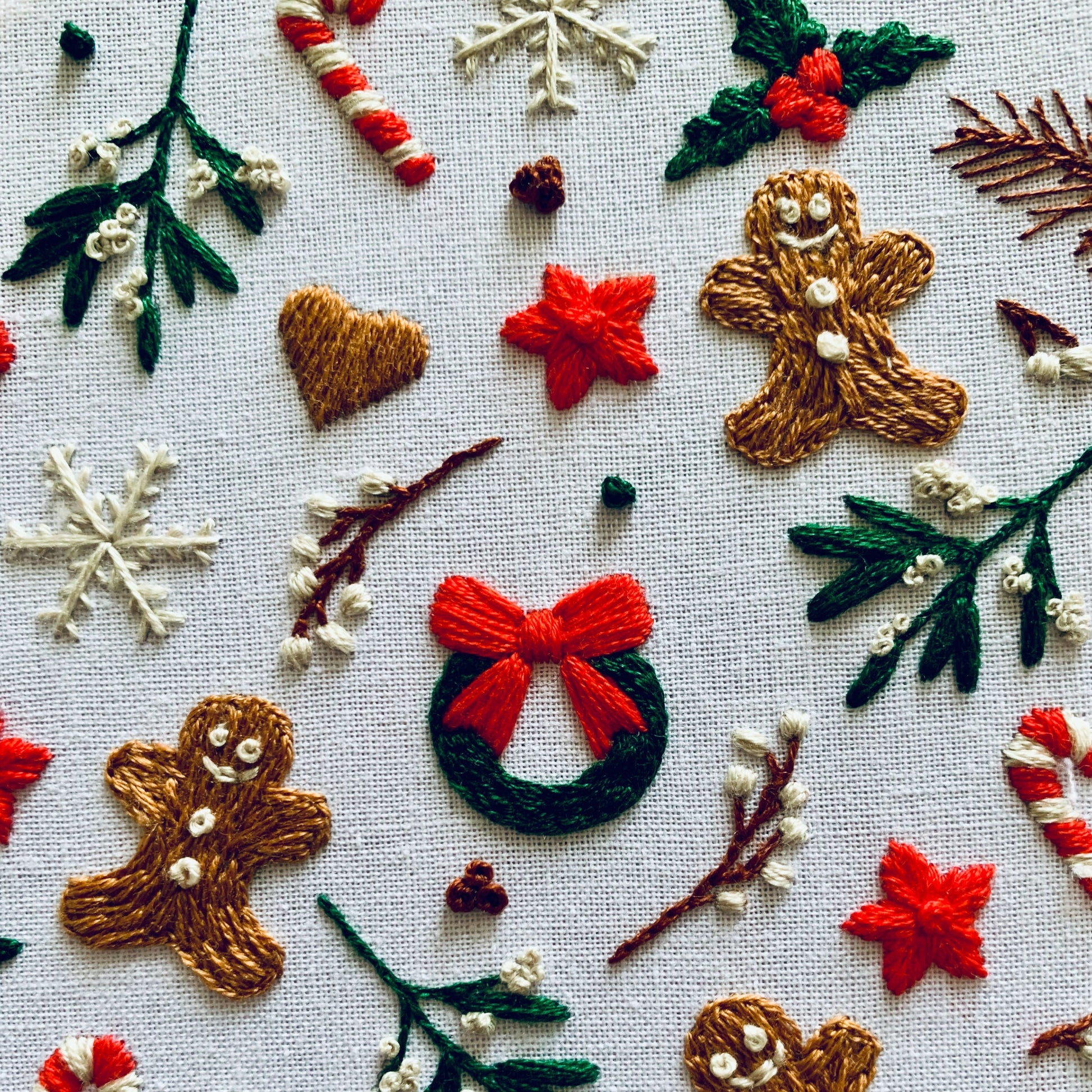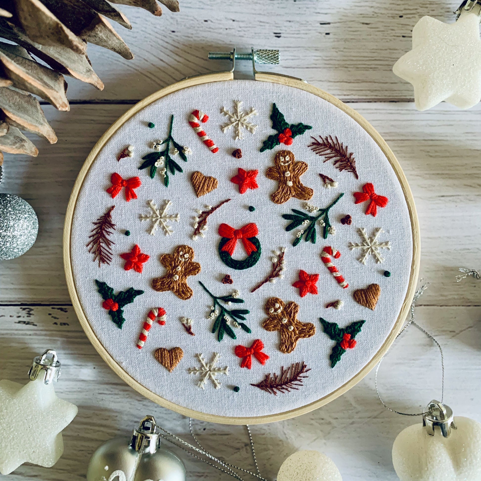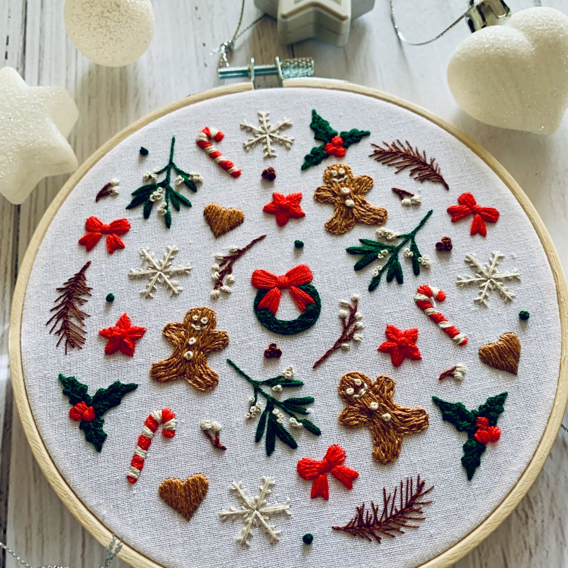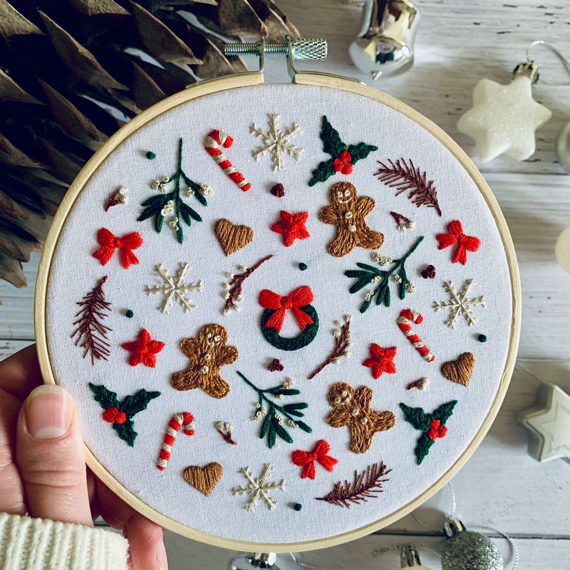 Digital download. Festive gingerbread embroidery hoop art PDF pattern with instructions. Christmas holiday beginner wall decor project