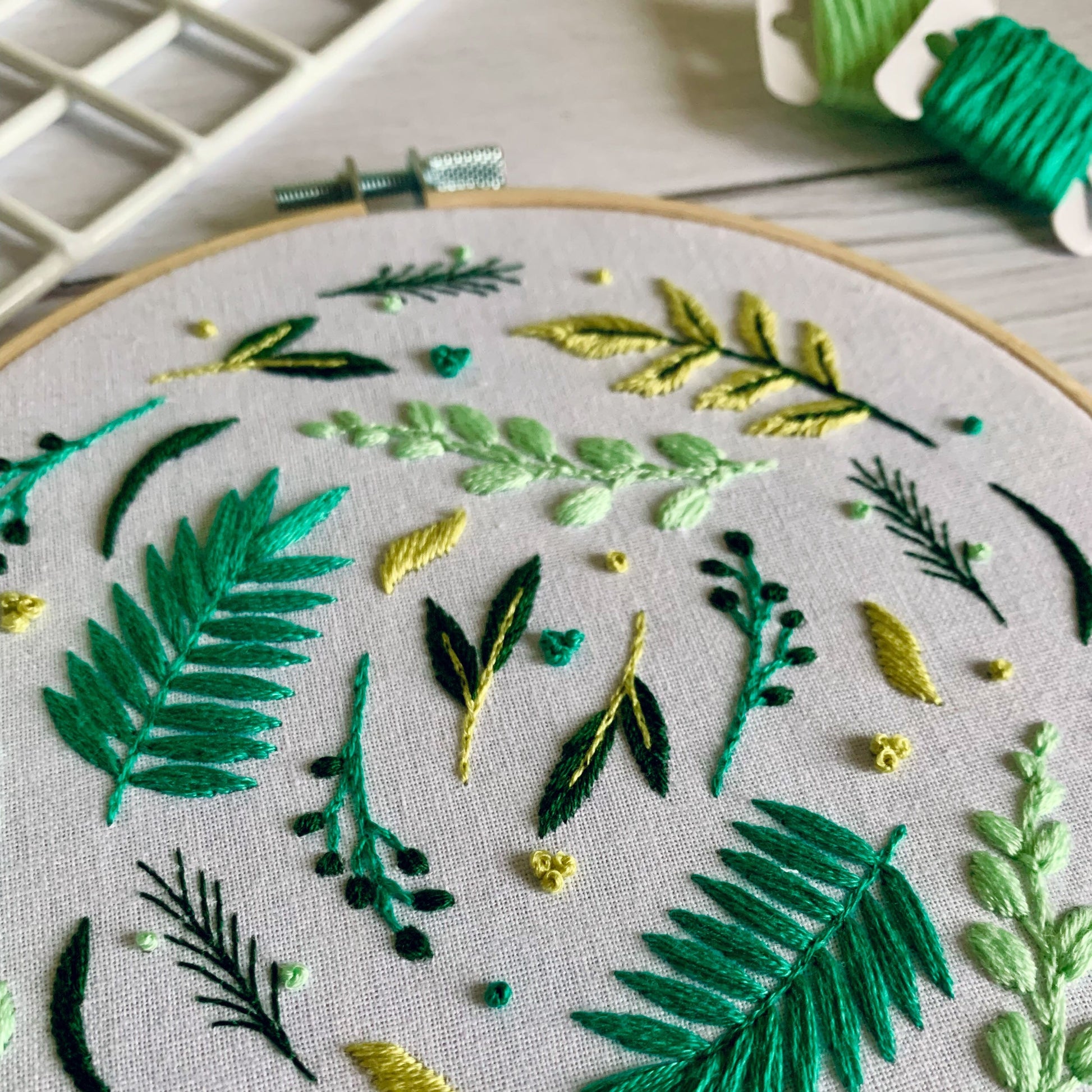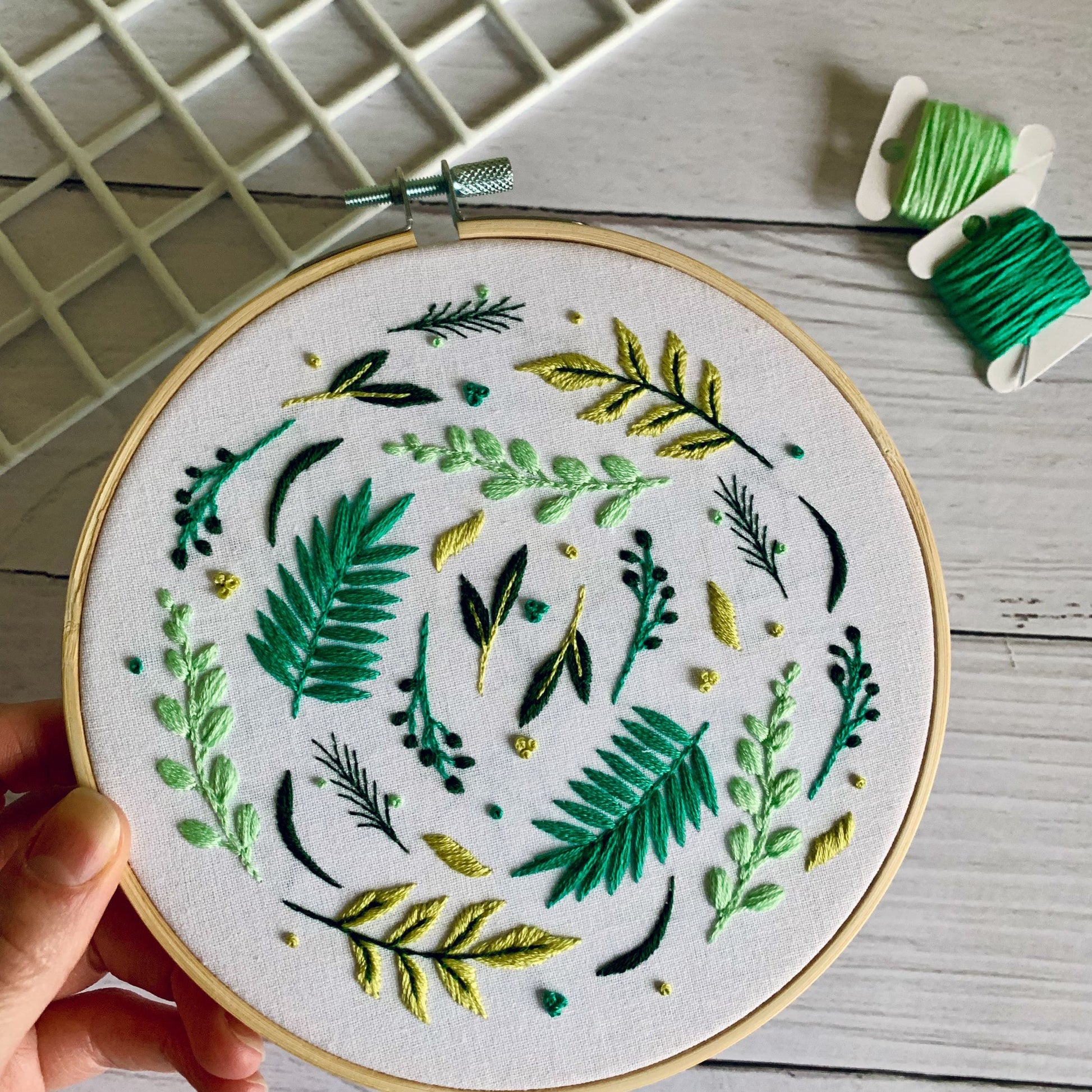 Digital download. Foliage embroidery hoop art PDF pattern with instructions. Leaf botanical plants beginner crewel wall decor project