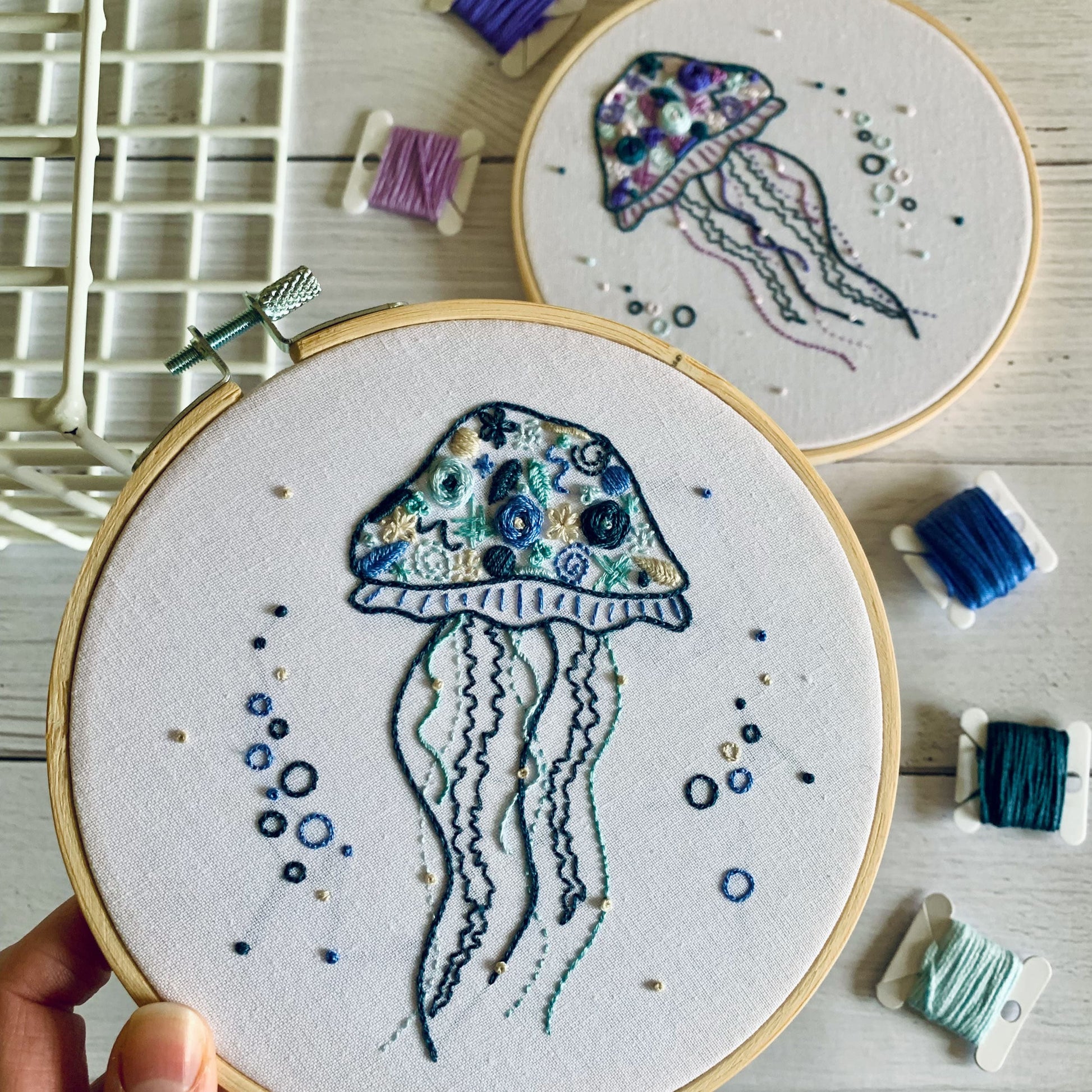 Digital download. Jellyfish embroidery hoop art PDF pattern with instructions. Sea life, sea animal beginner crewel wall decor project