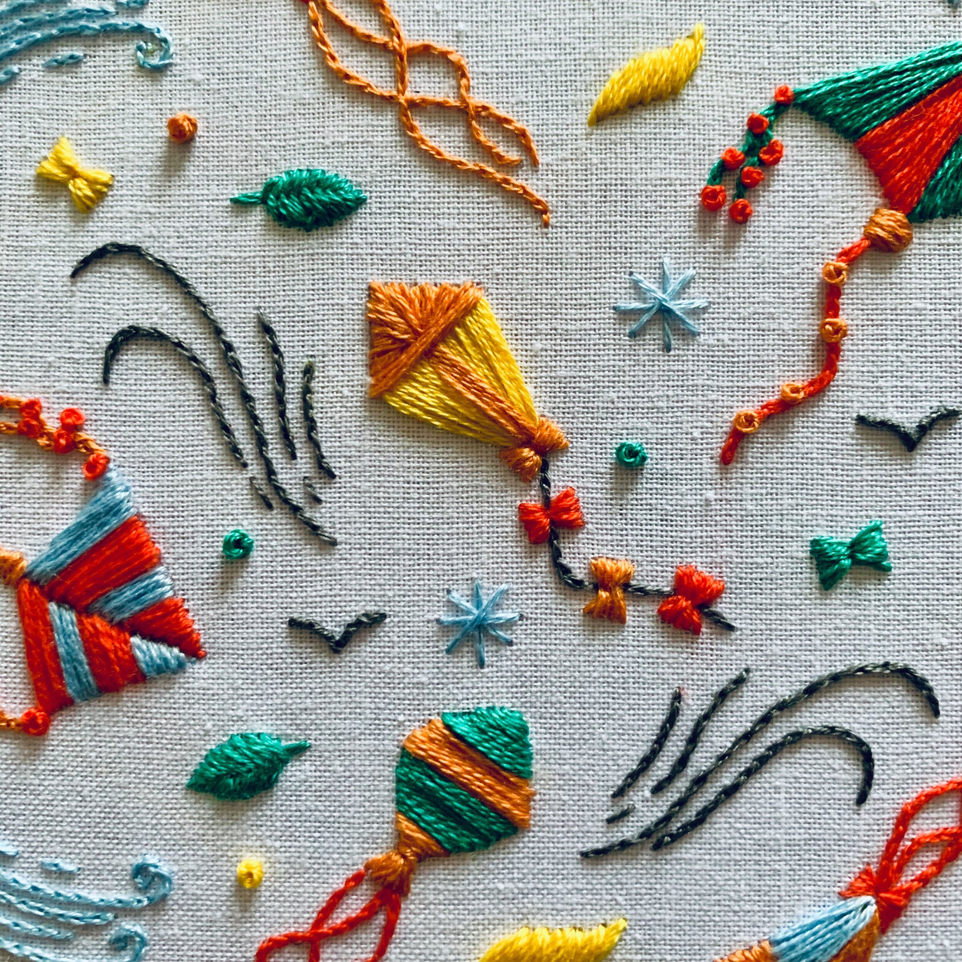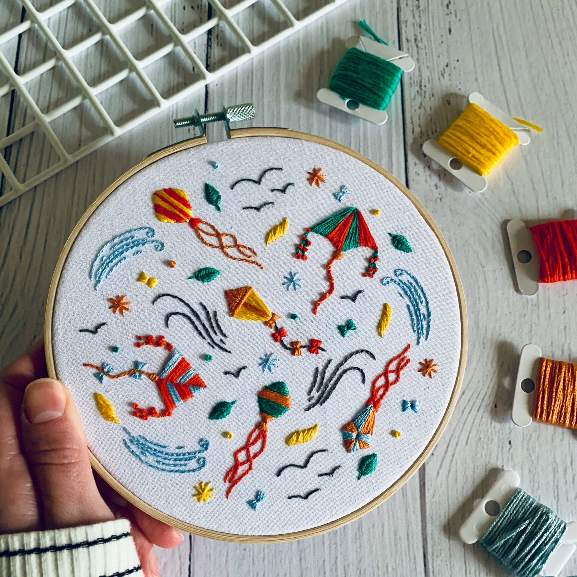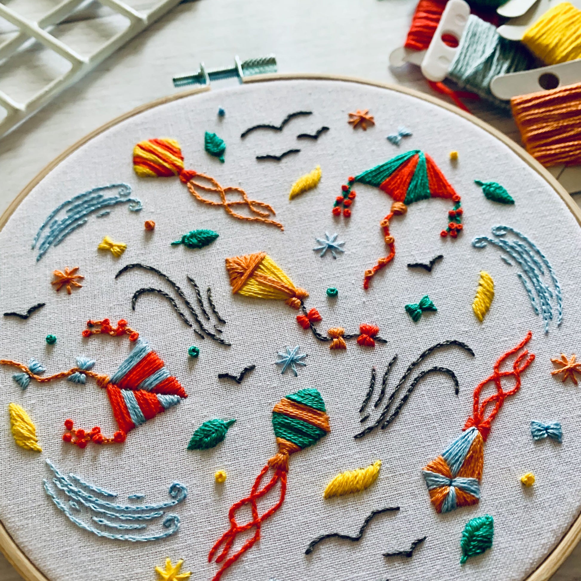 Digital download. Kites embroidery hoop art PDF pattern with instructions. Outdoor birds beginner crewel wall decor project