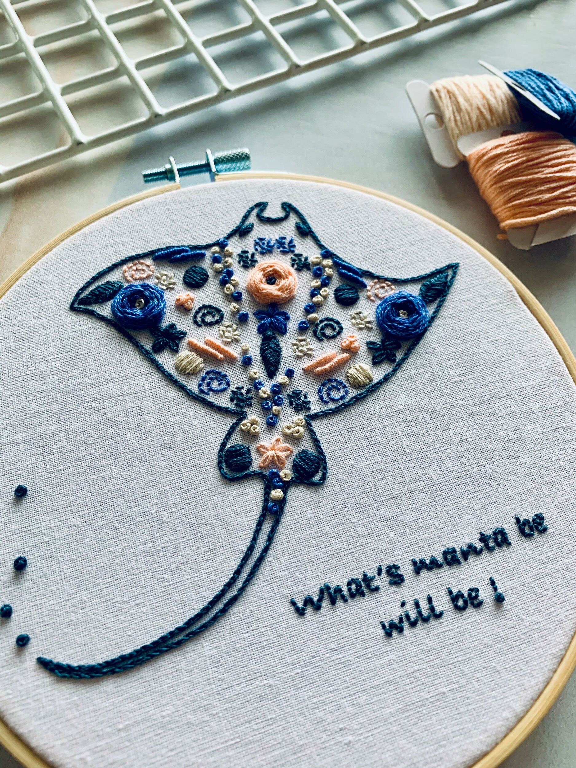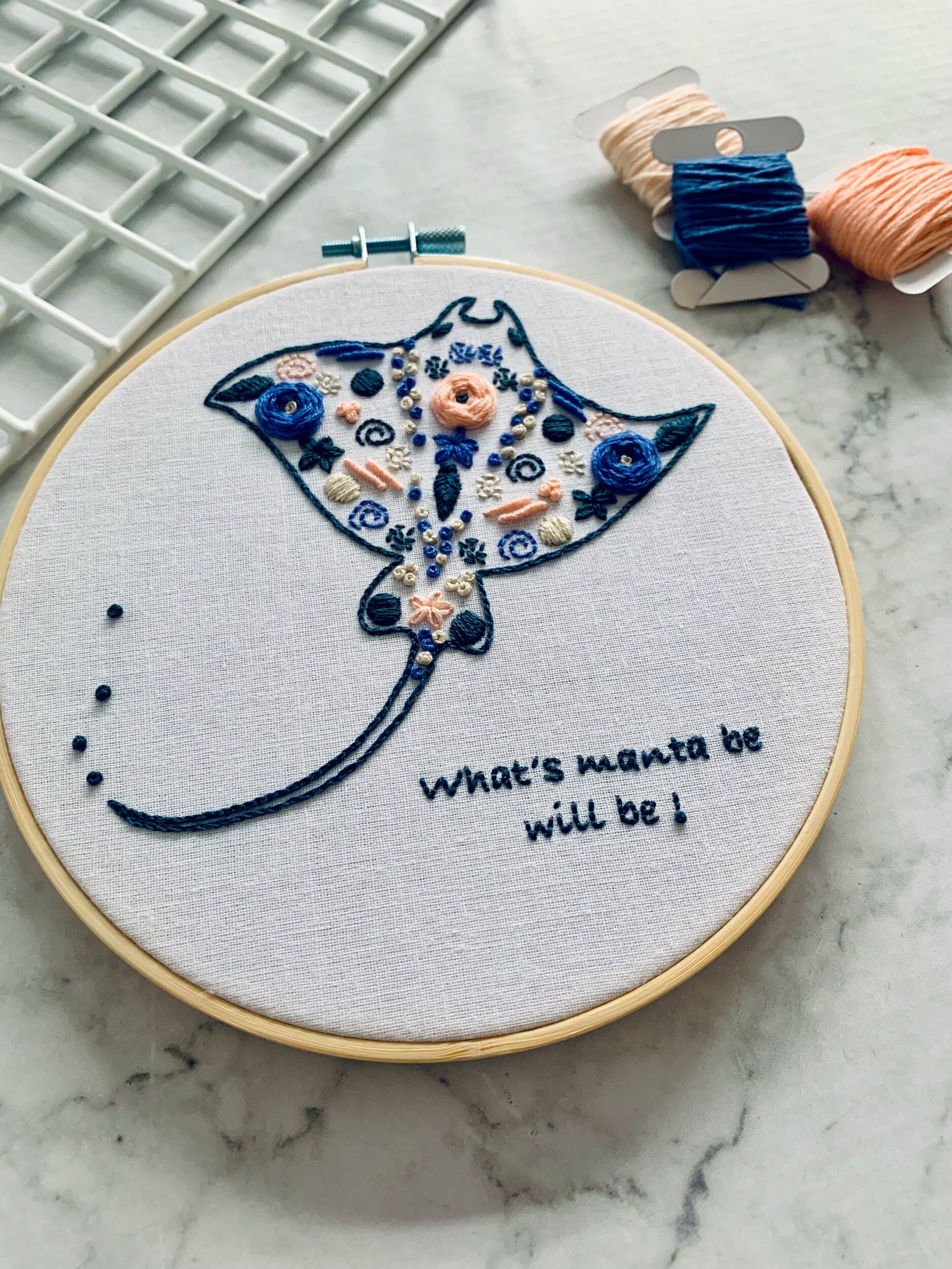 Digital download. Manta Ray embroidery hoop art PDF pattern with instructions. Sting ray sea animal beginner crewel wall decor project
