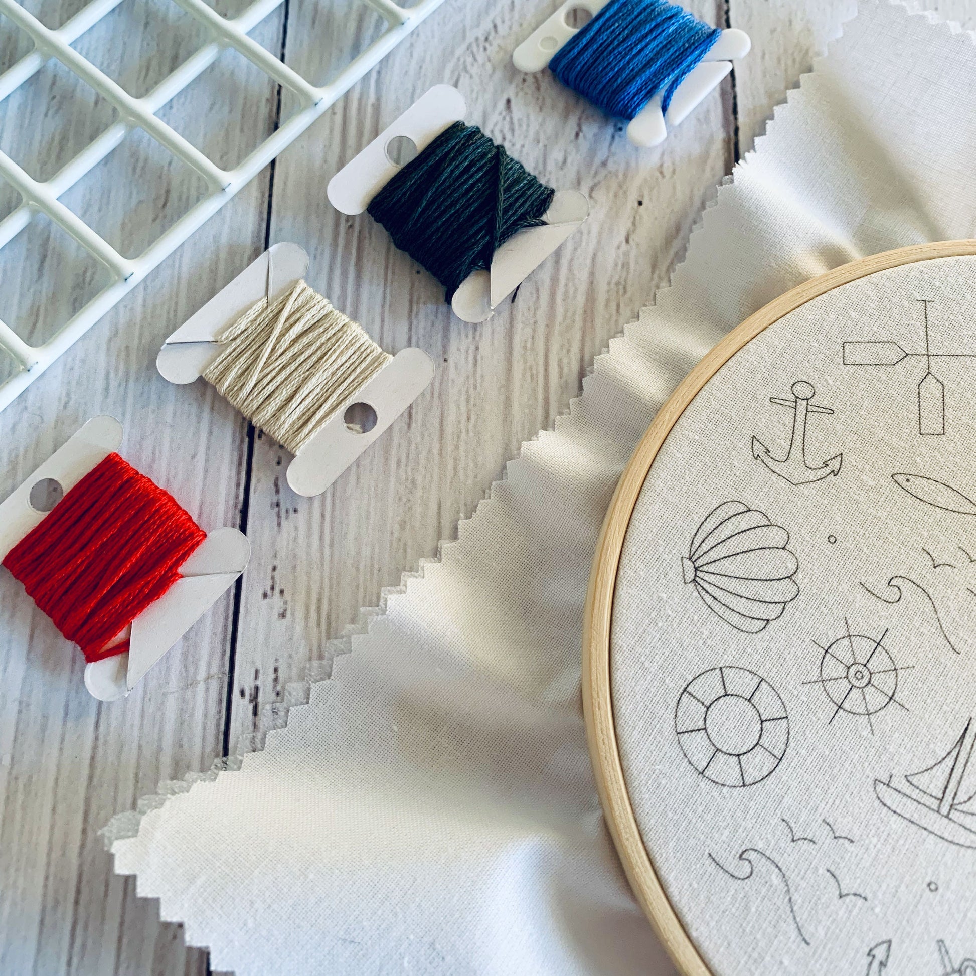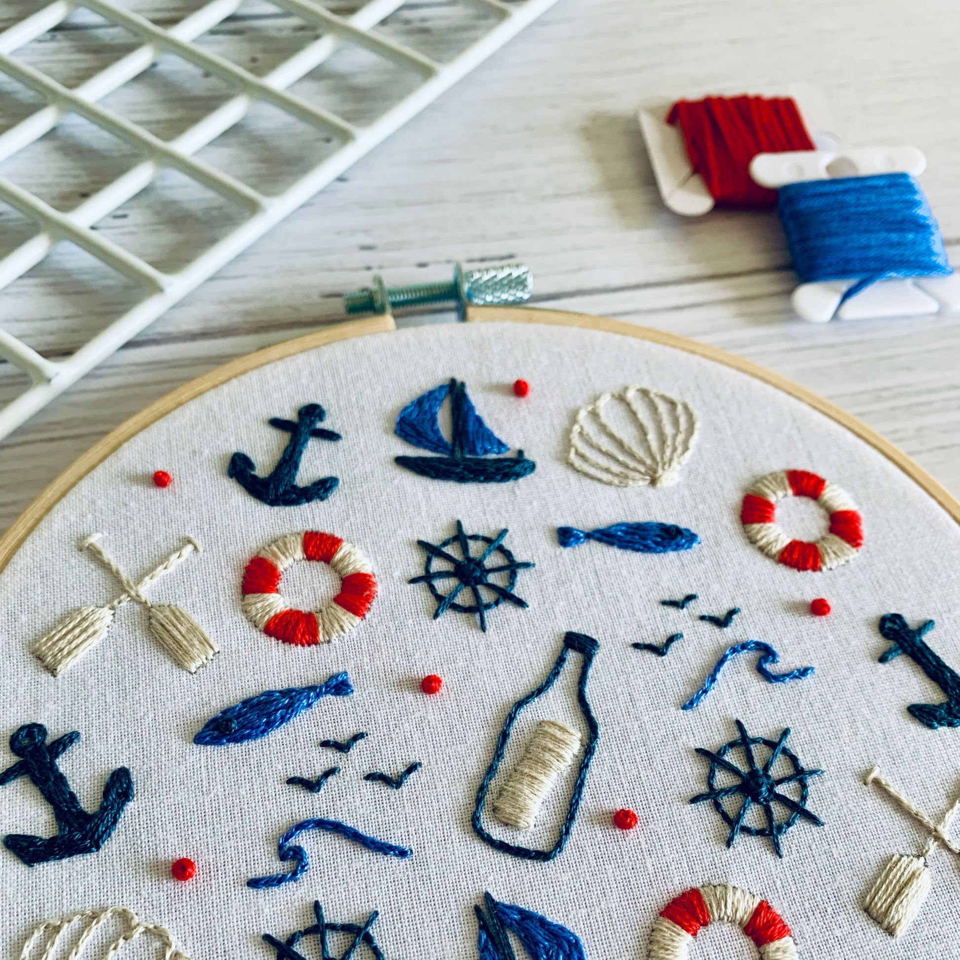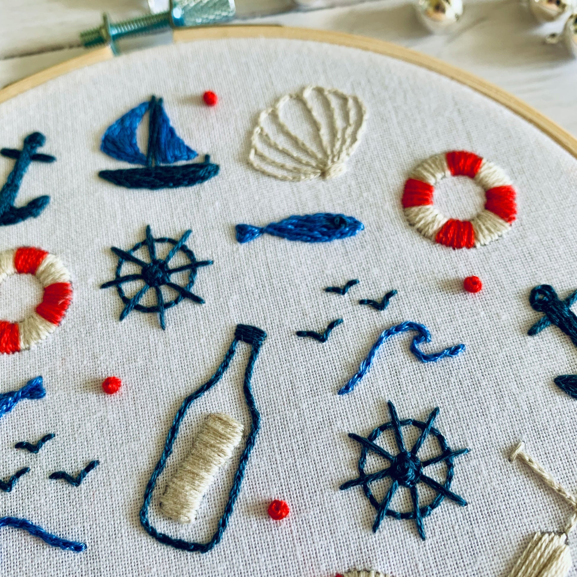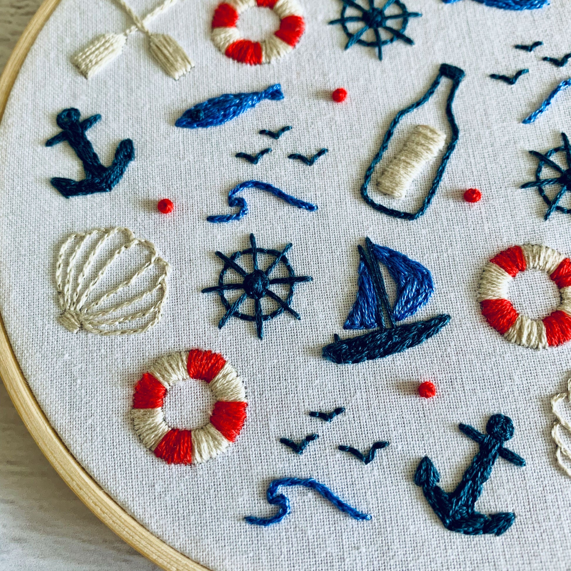 Digital download. Nautical embroidery hoop art PDF pattern with instructions. Seaside beginner crewel wall decor project