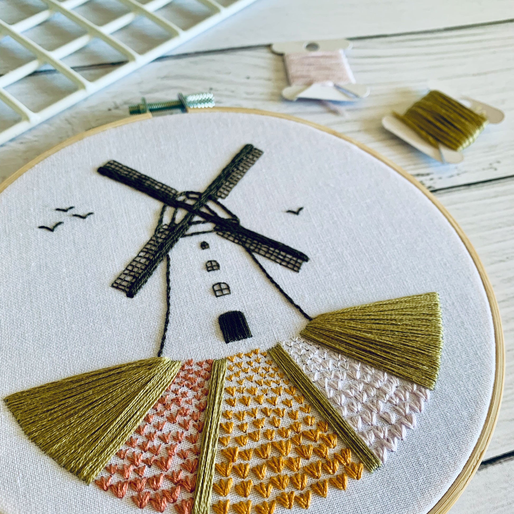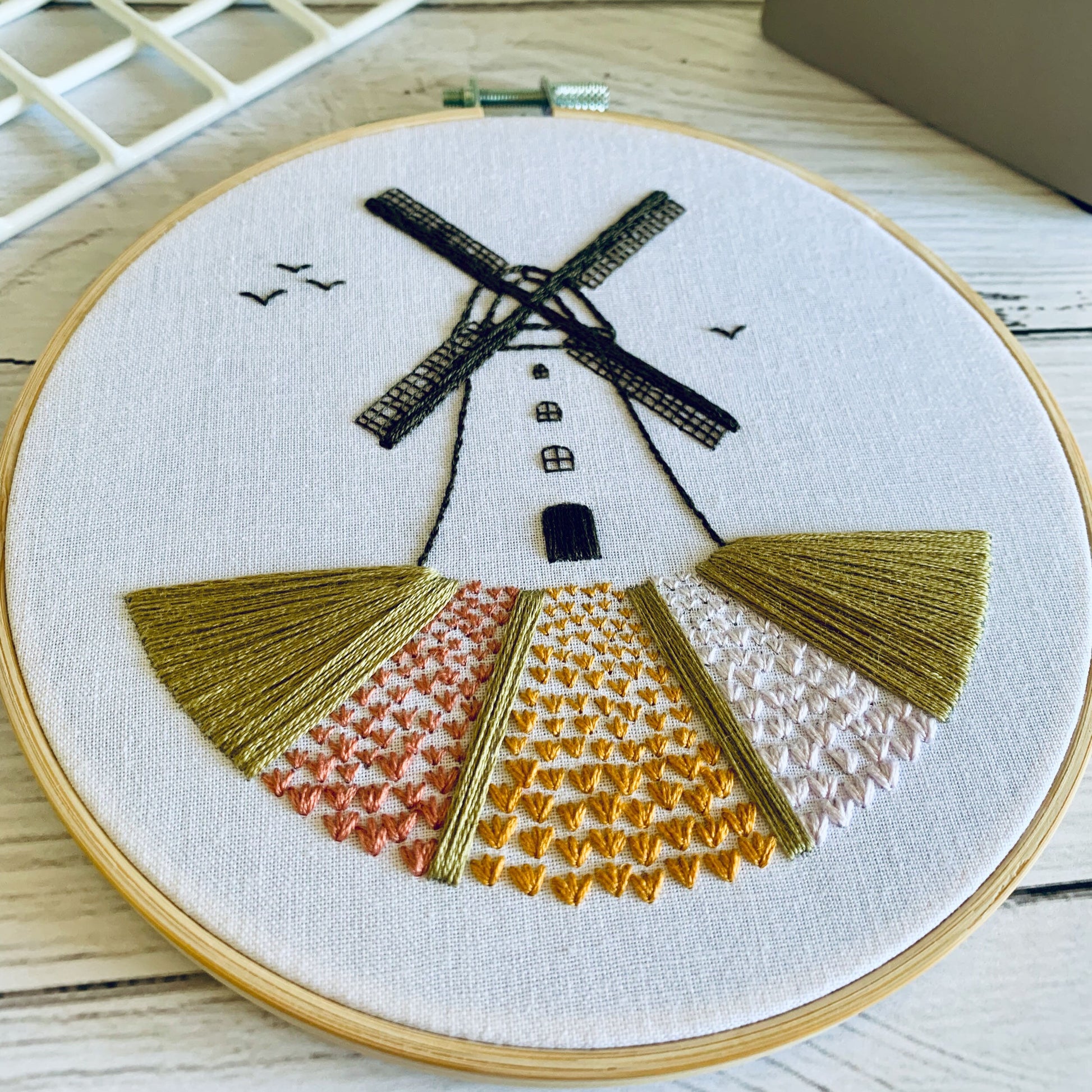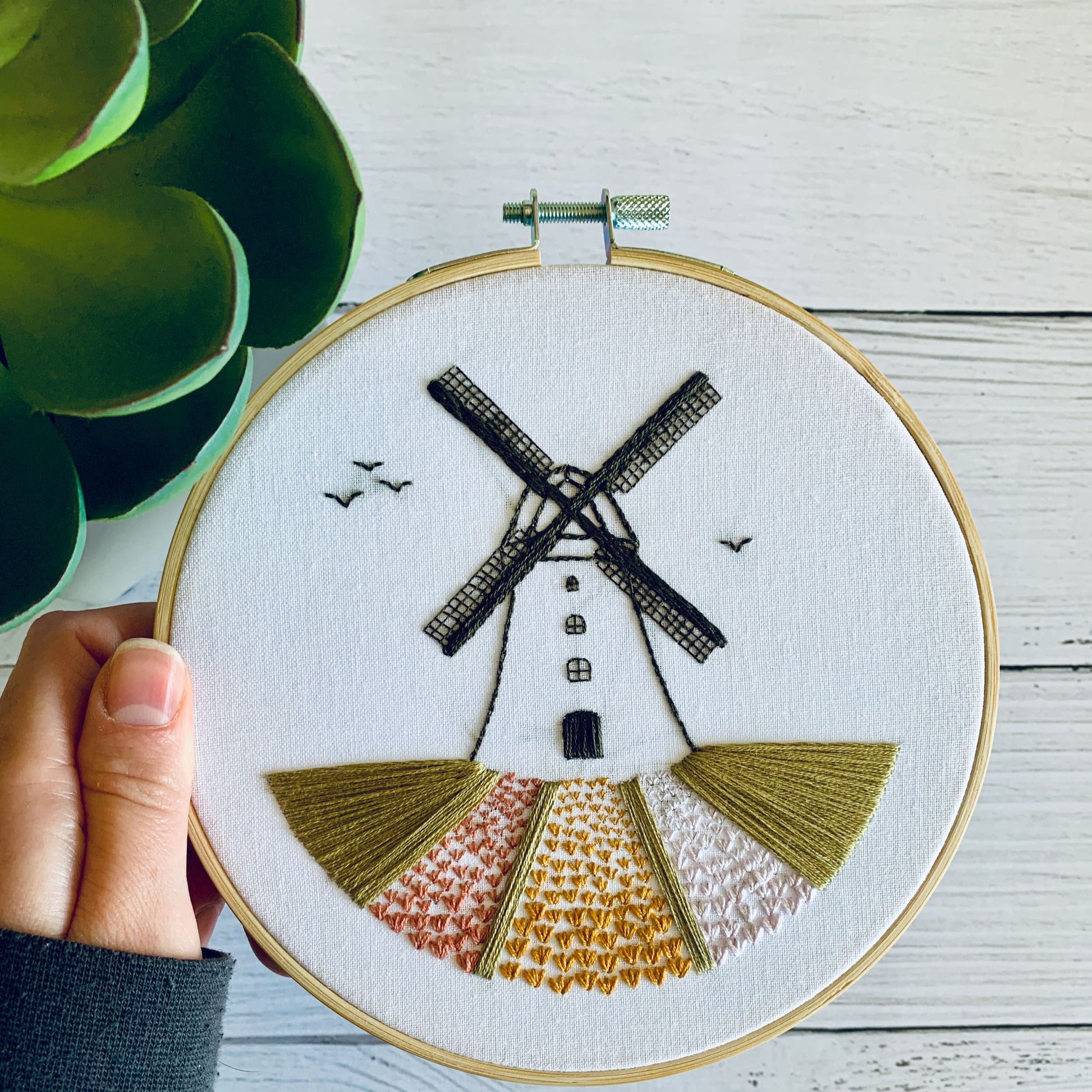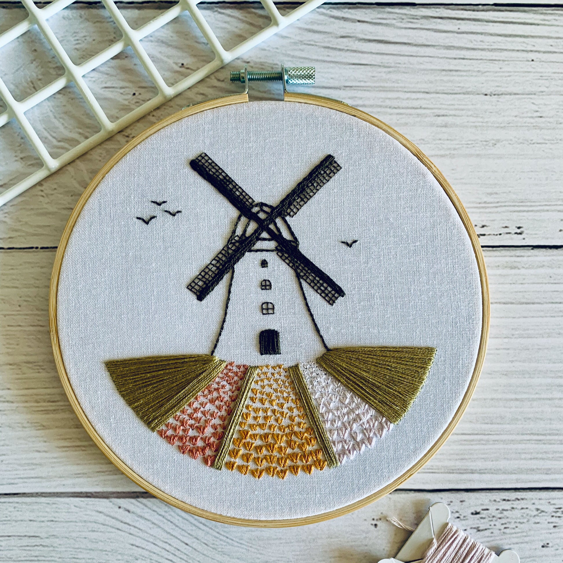 Digital download. Windmill and tulip fields embroidery hoop art PDF pattern with instructions
