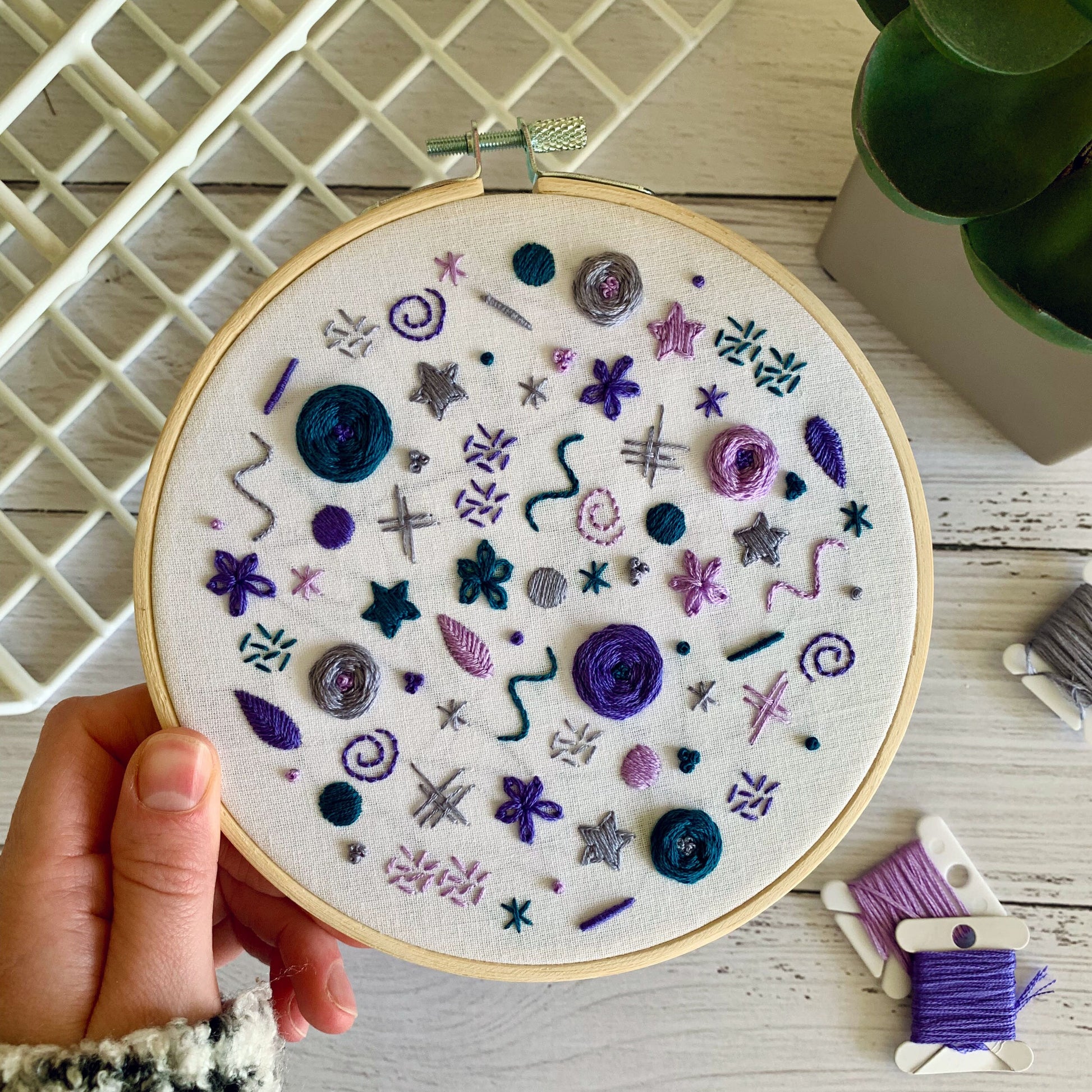 Full embroidery kit. Beginner doodle DIY hoop art craft. Includes 11 stitches! Adult anxiety/stress relief squiggle gift