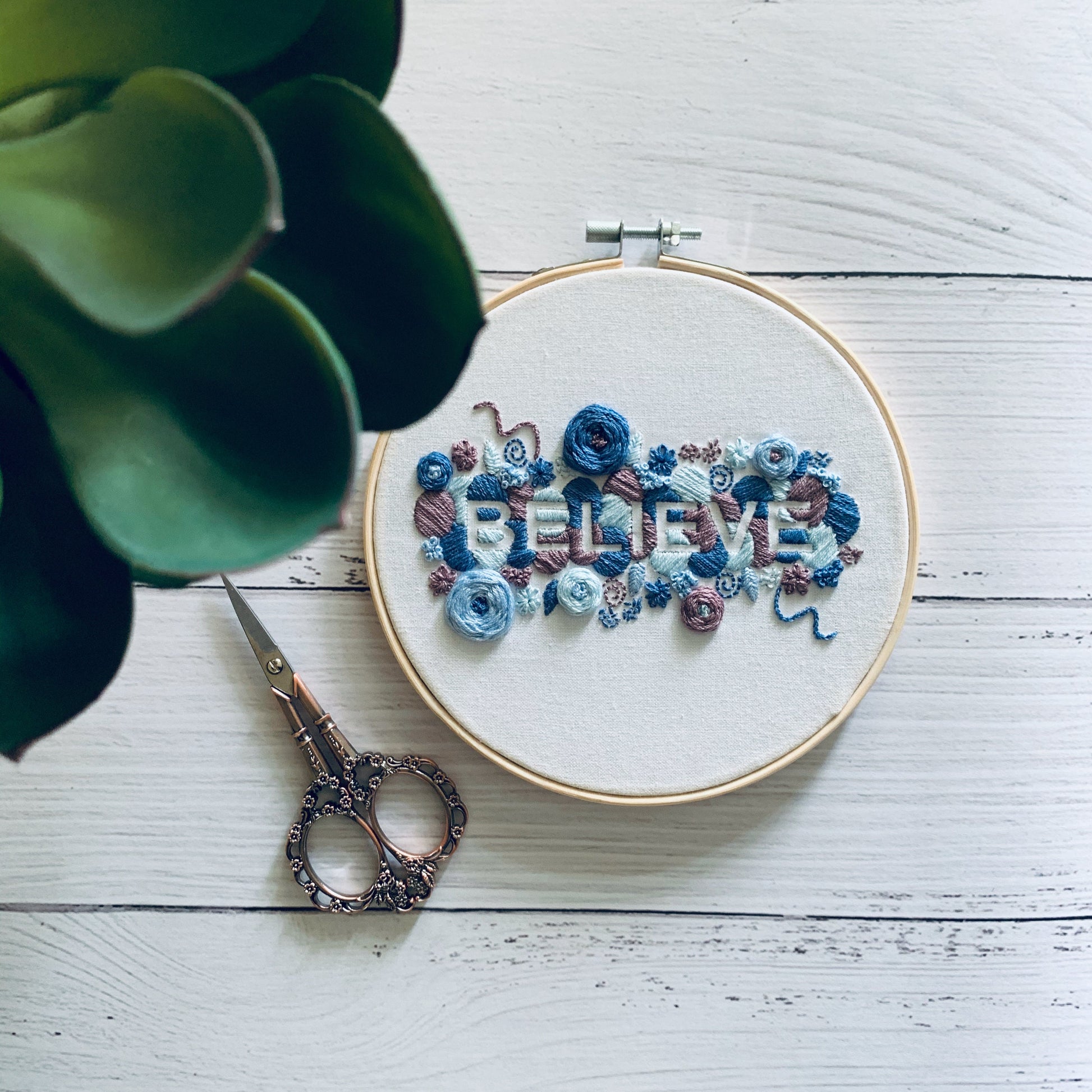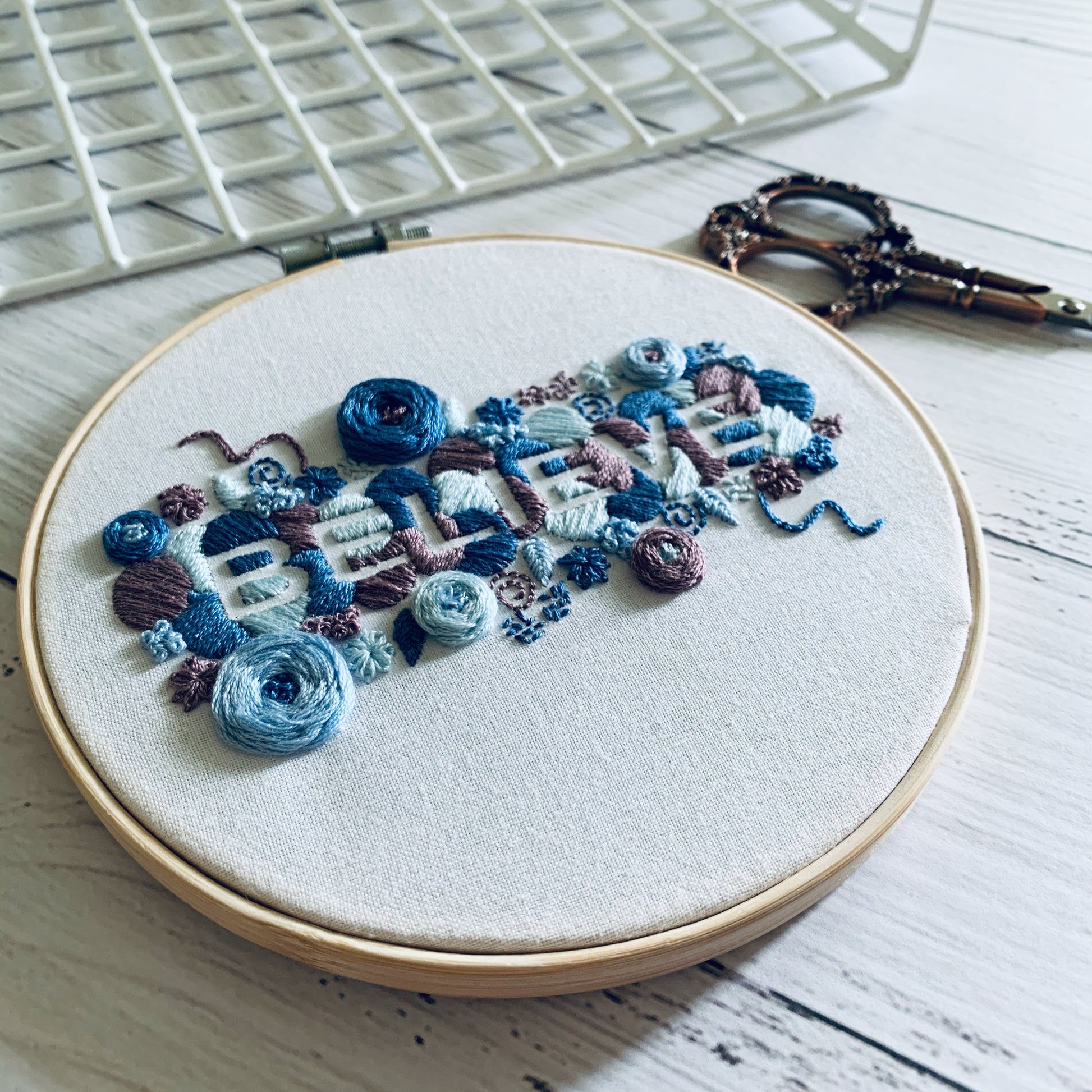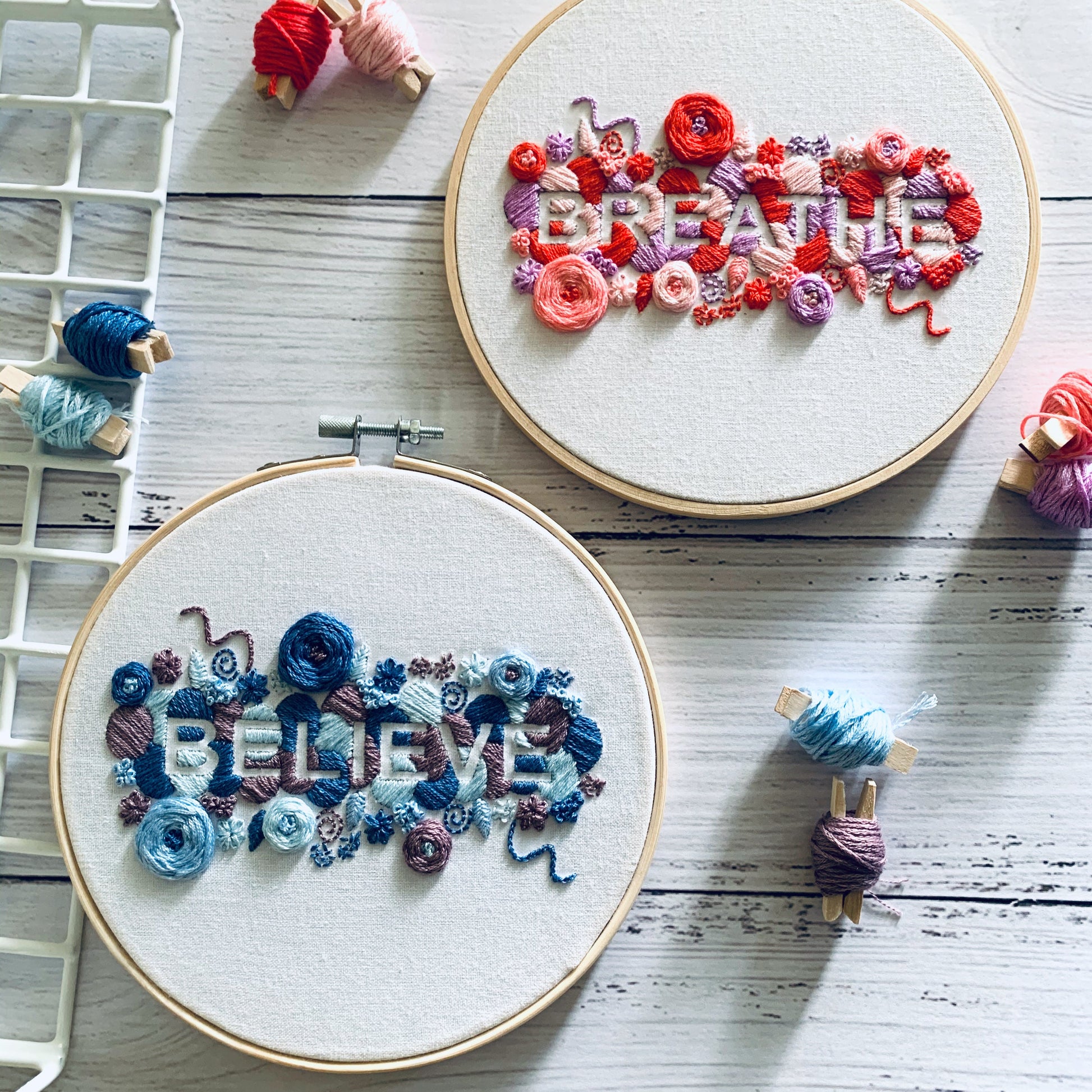 Full embroidery kit. Breathe/Believe positive word hoop art. Choose your colours! Mindfulness.