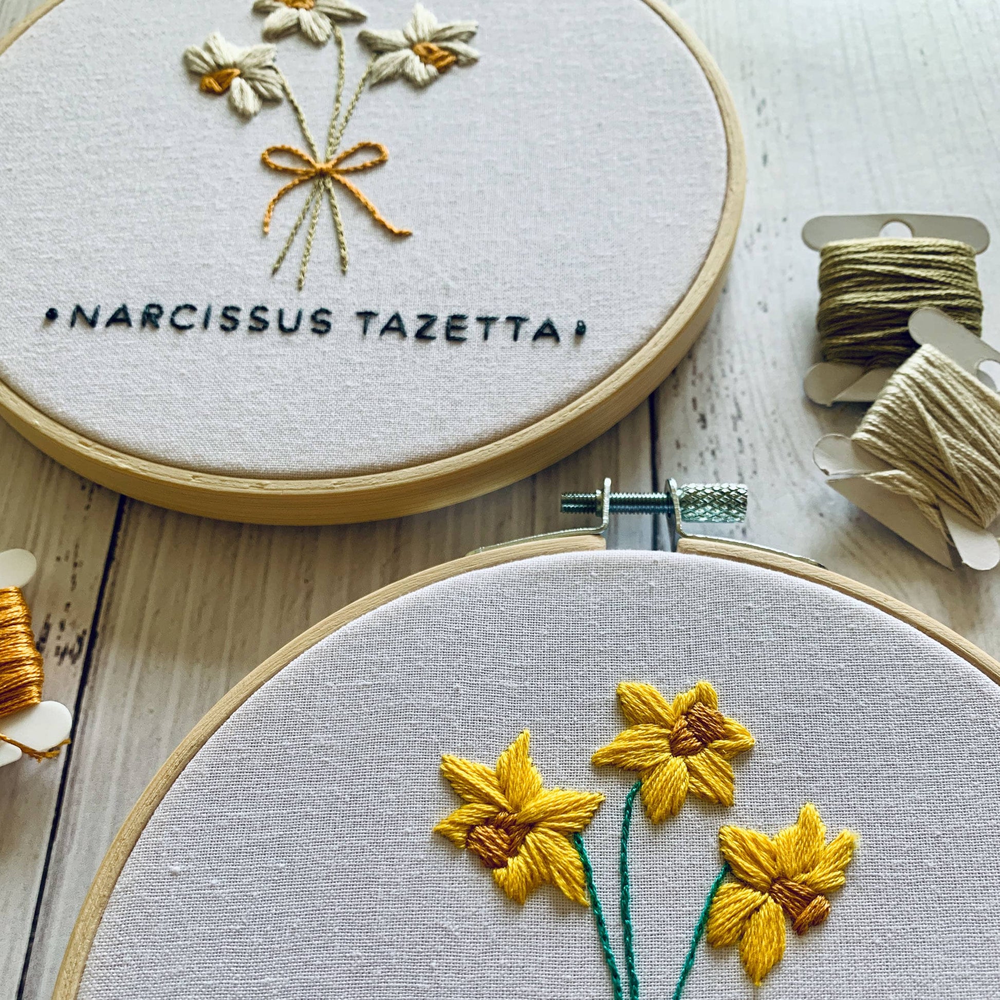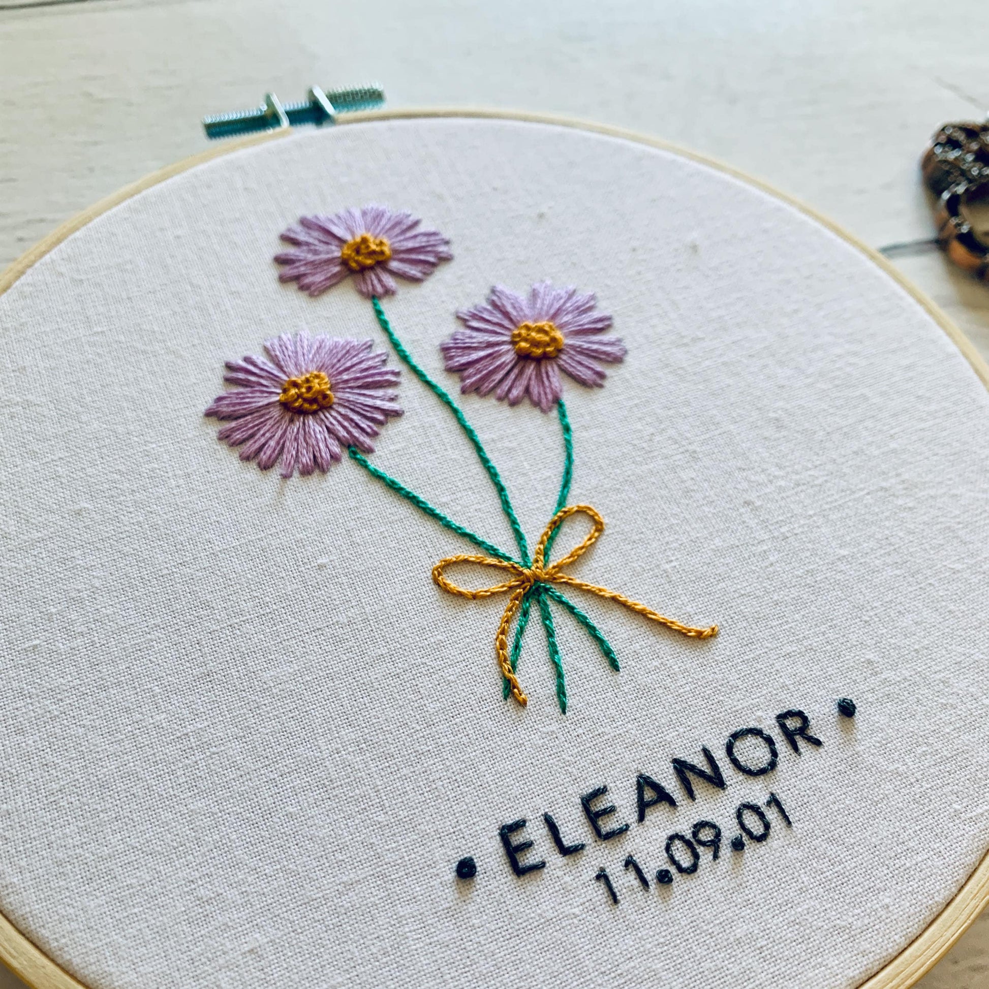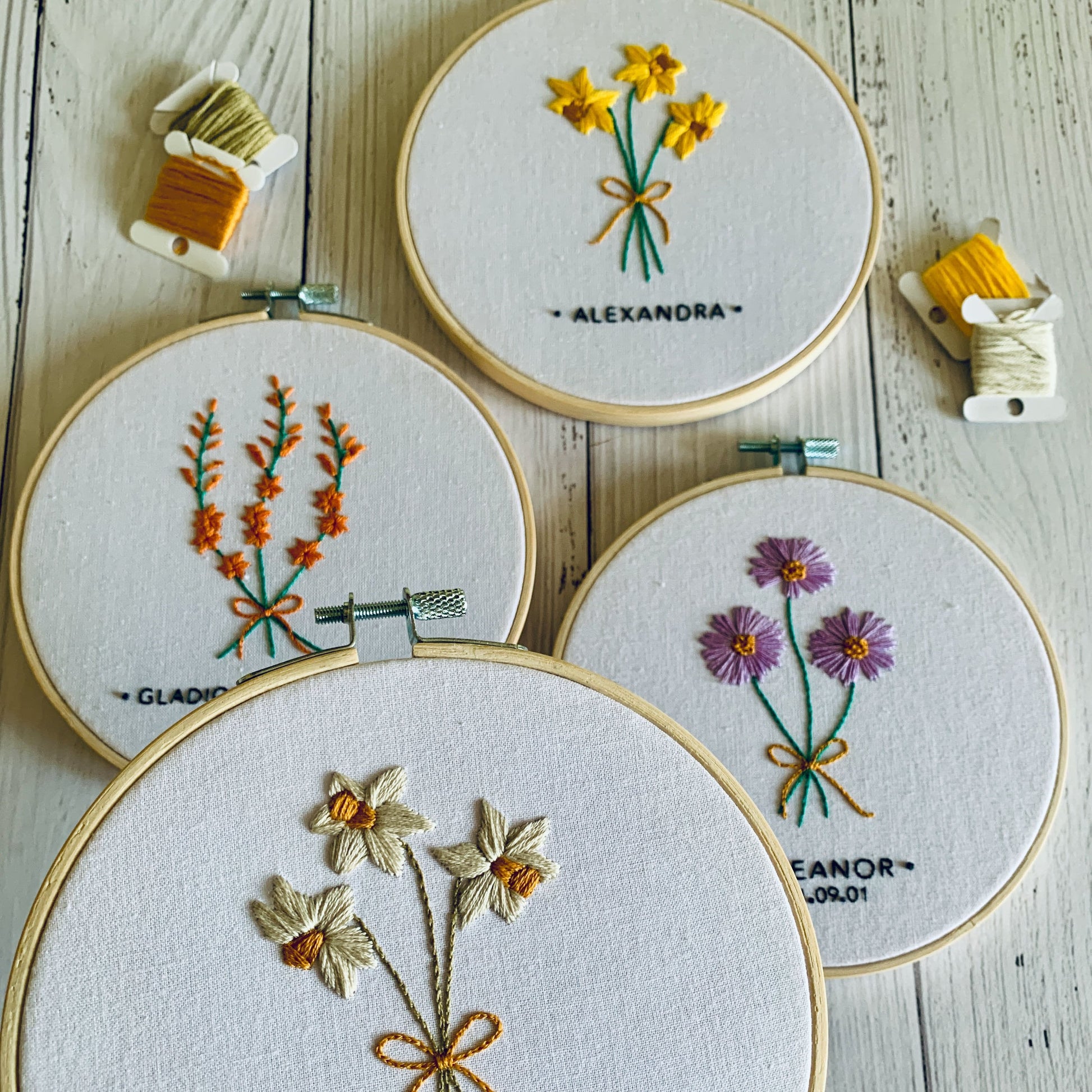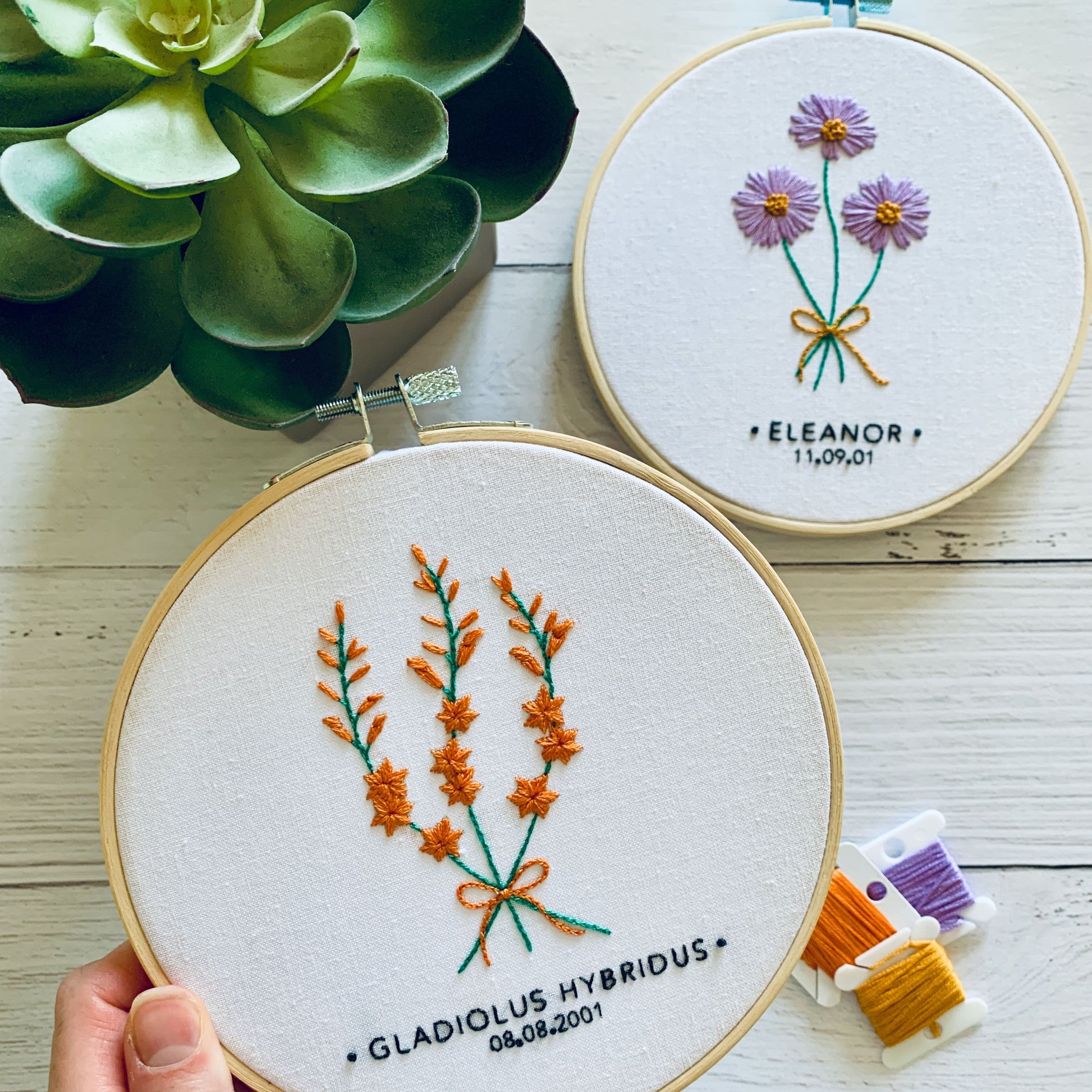 Full embroidery kit. Custom birthday florals hoop art. Choose your birth month flower, name and date. Beginner hand sewing gift or project.