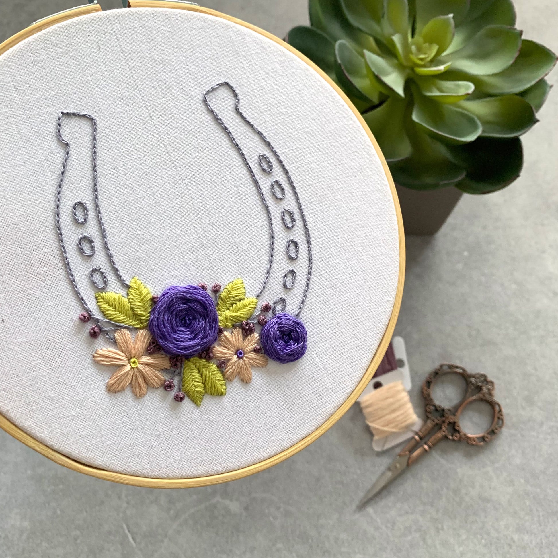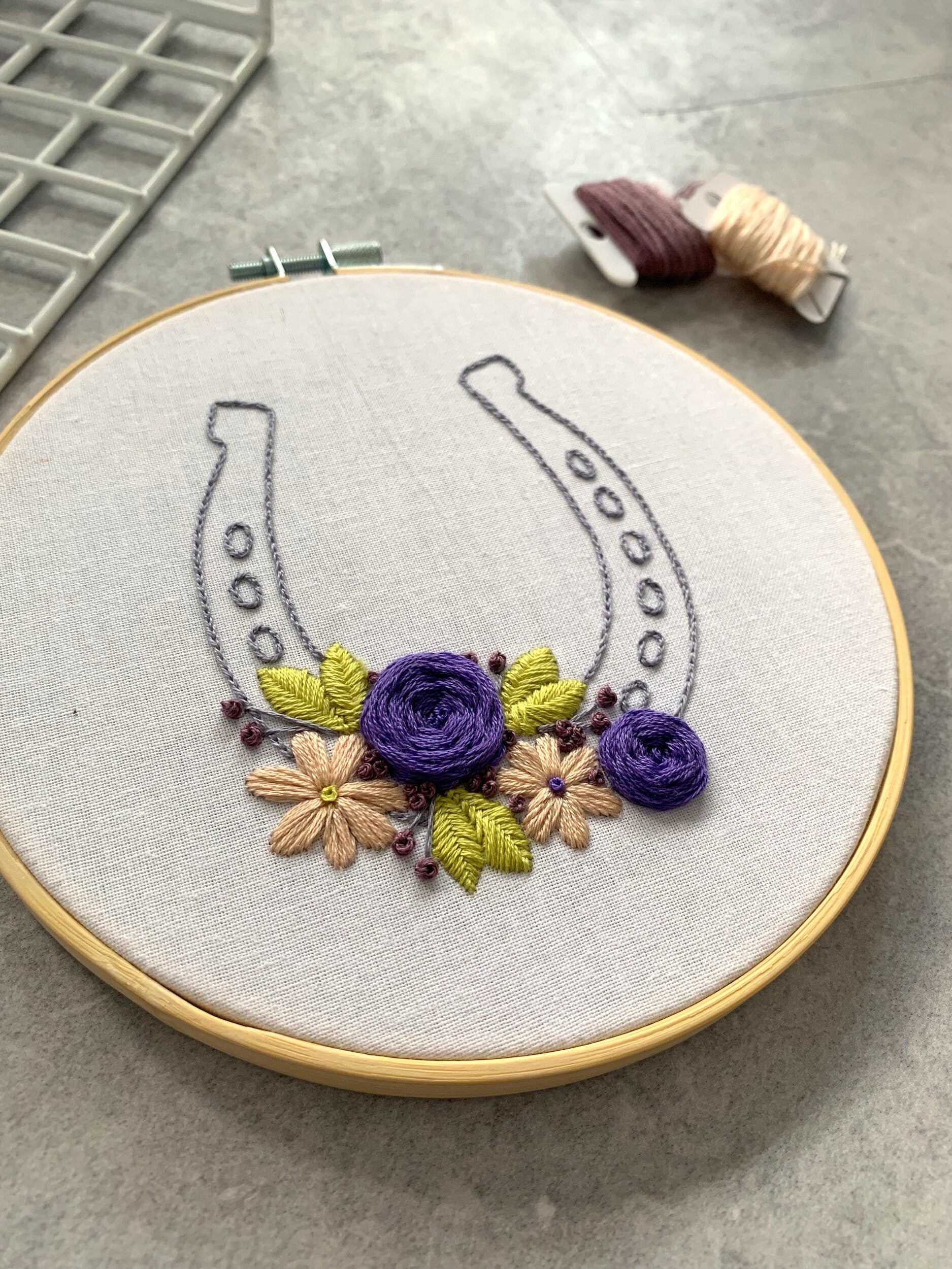 Full embroidery kit. Floral lucky horseshoe hoop art. Mindfulness diy project