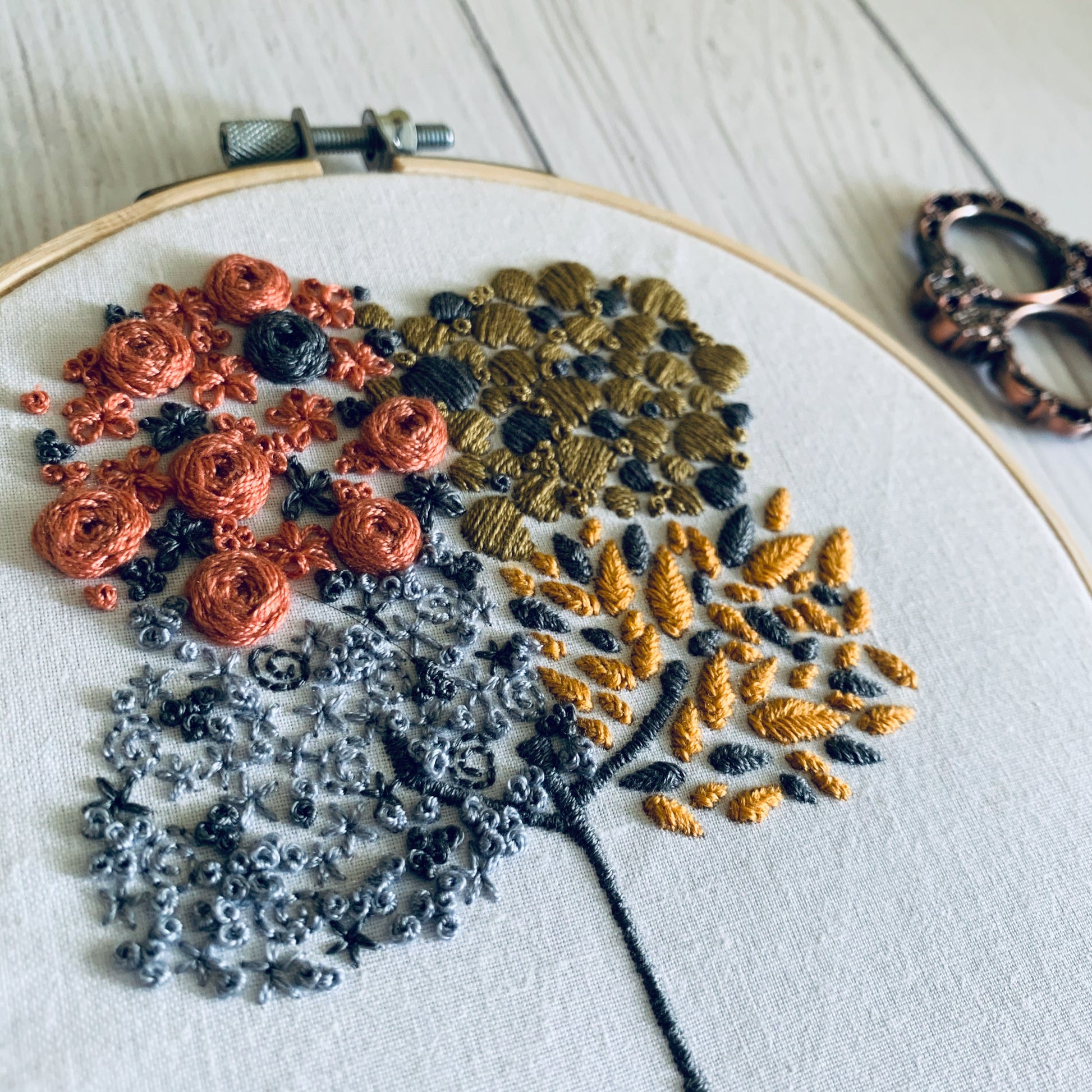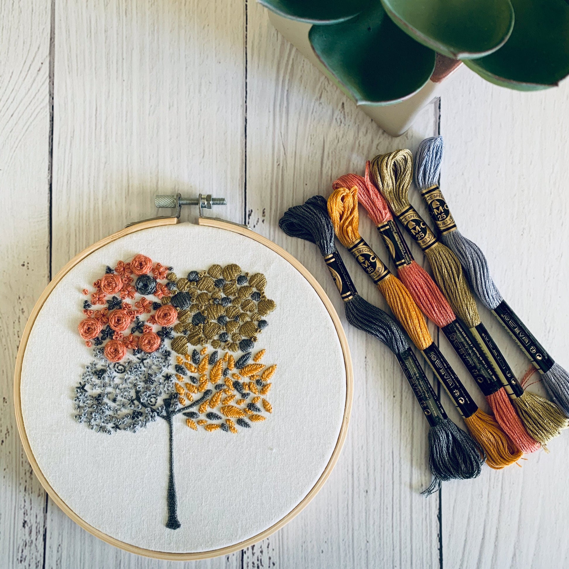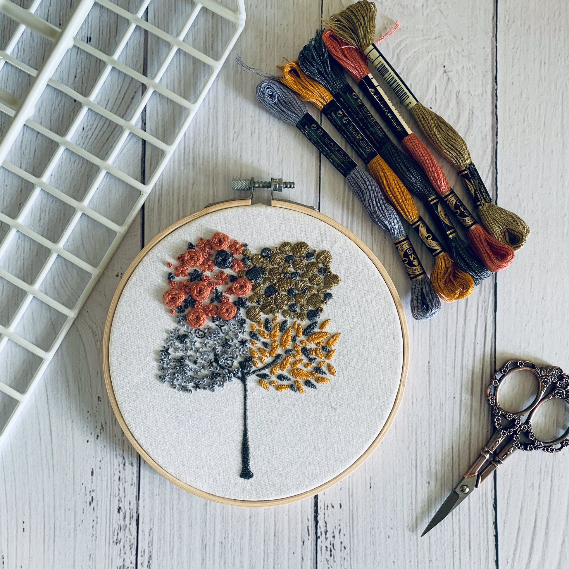 Full embroidery kit. Four seasons hoop art. Mindful hand sewing pattern with materials