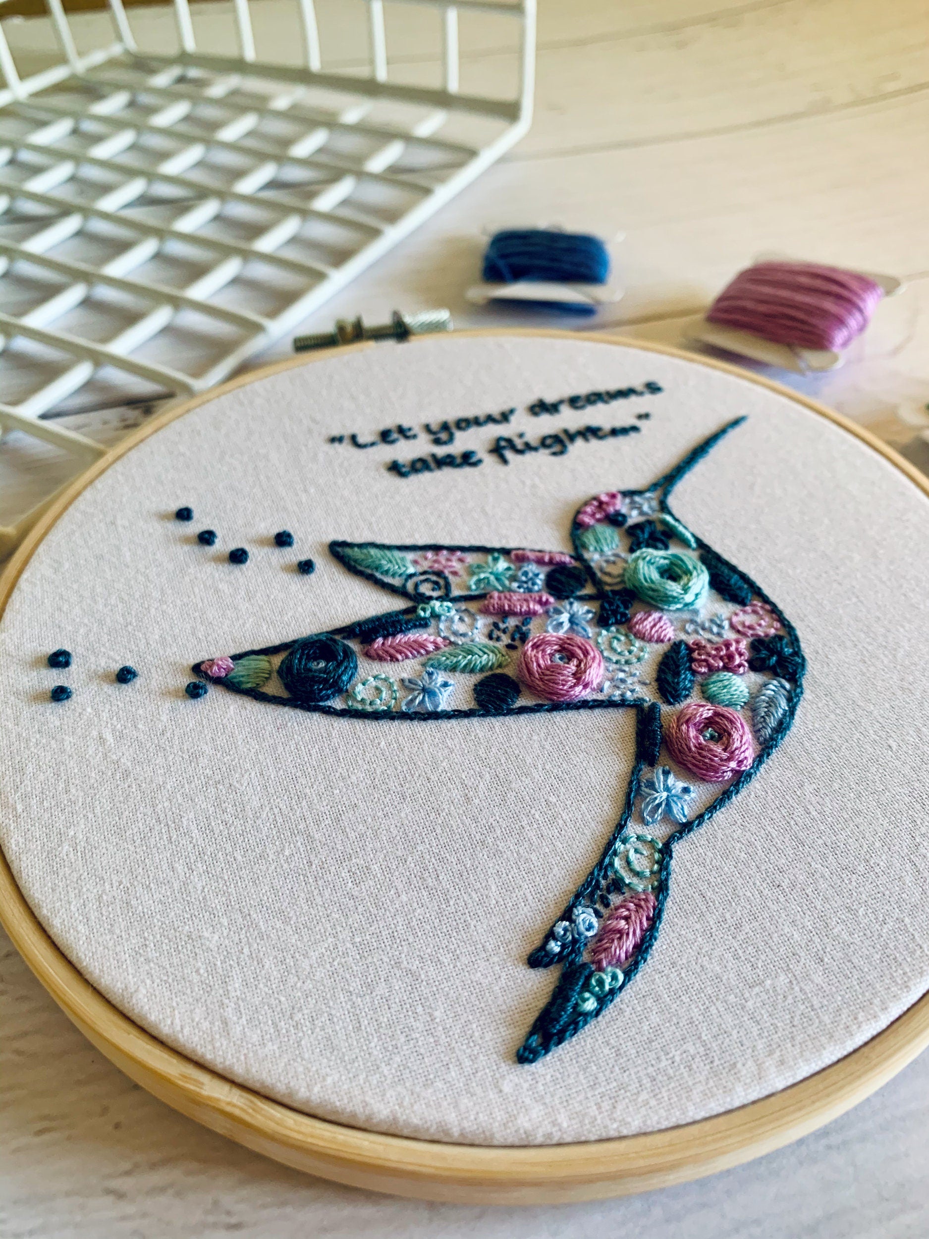 Full embroidery kit. Hummingbird DIY modern hoop art. Creative bird craft gift for adult mindfulness.
