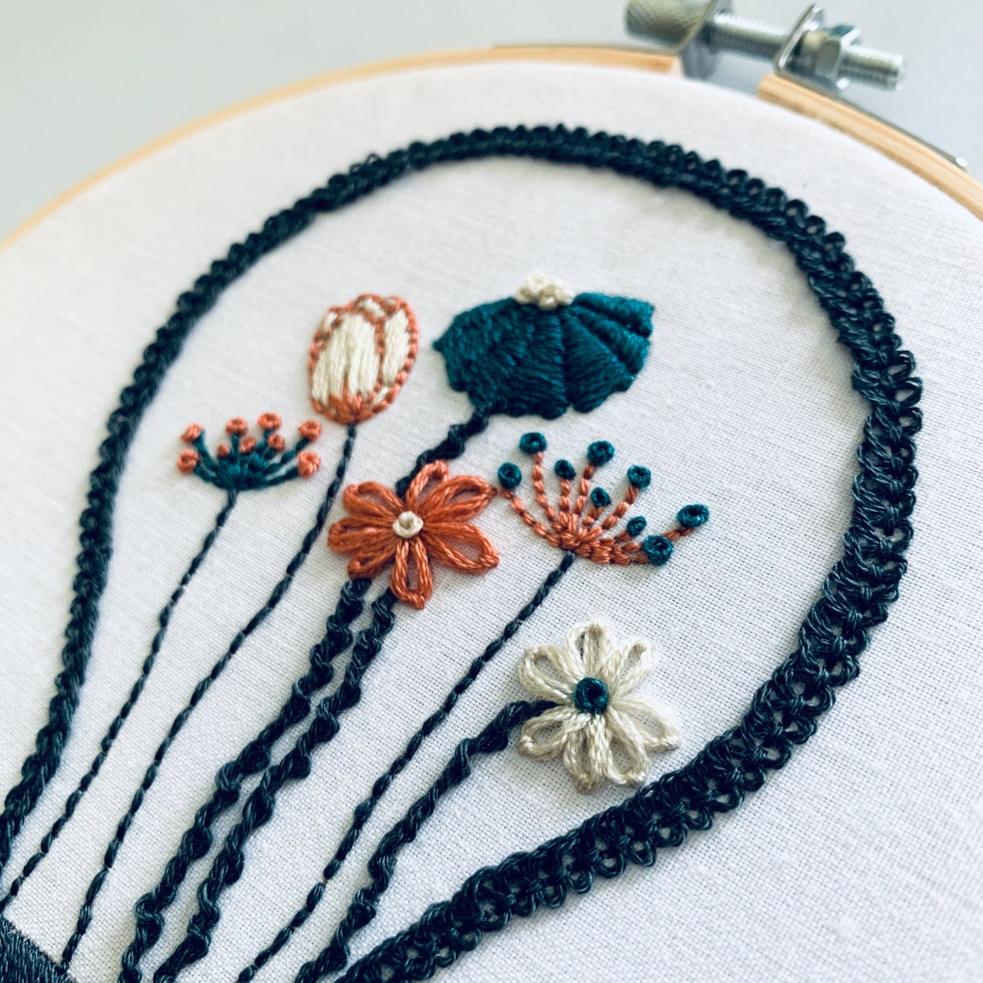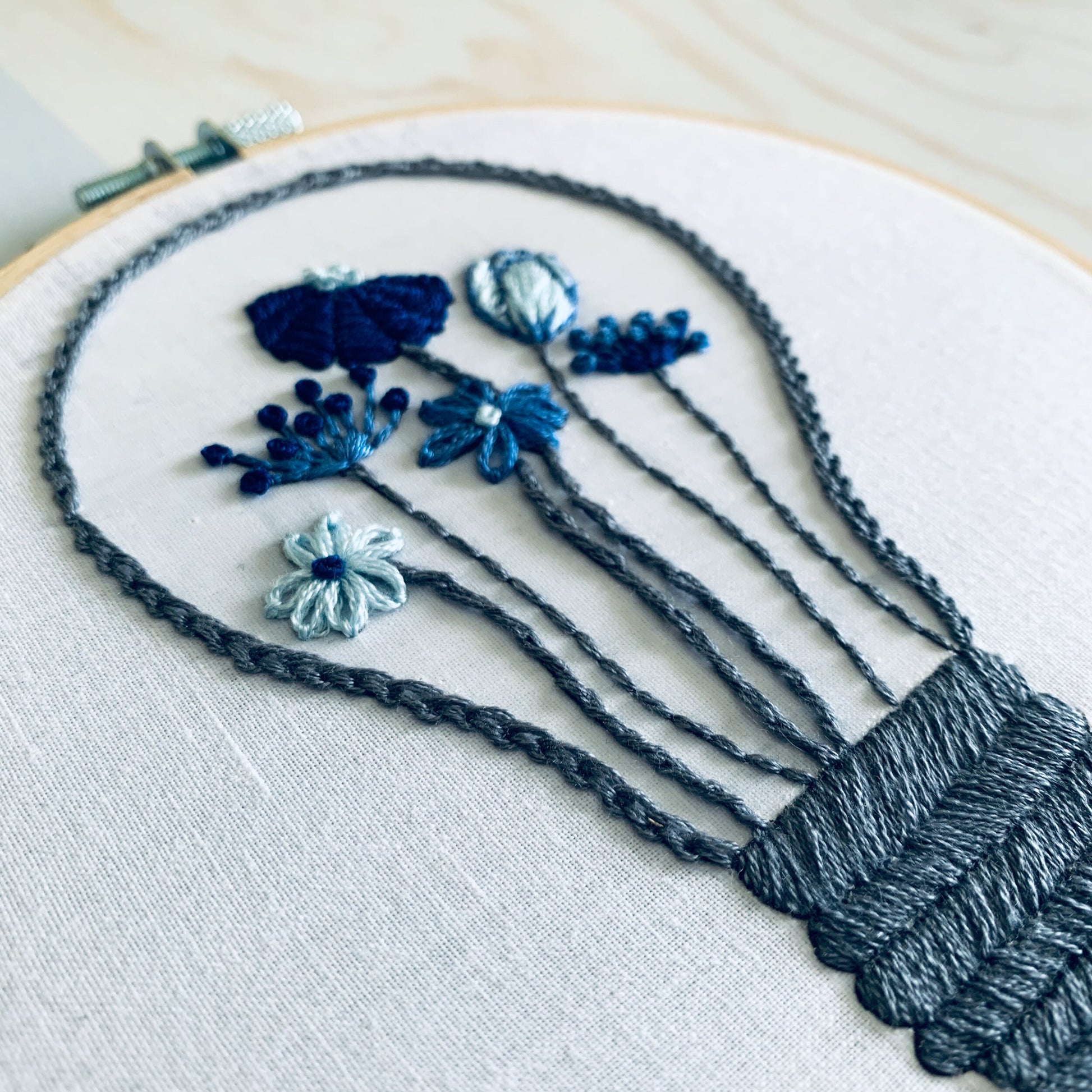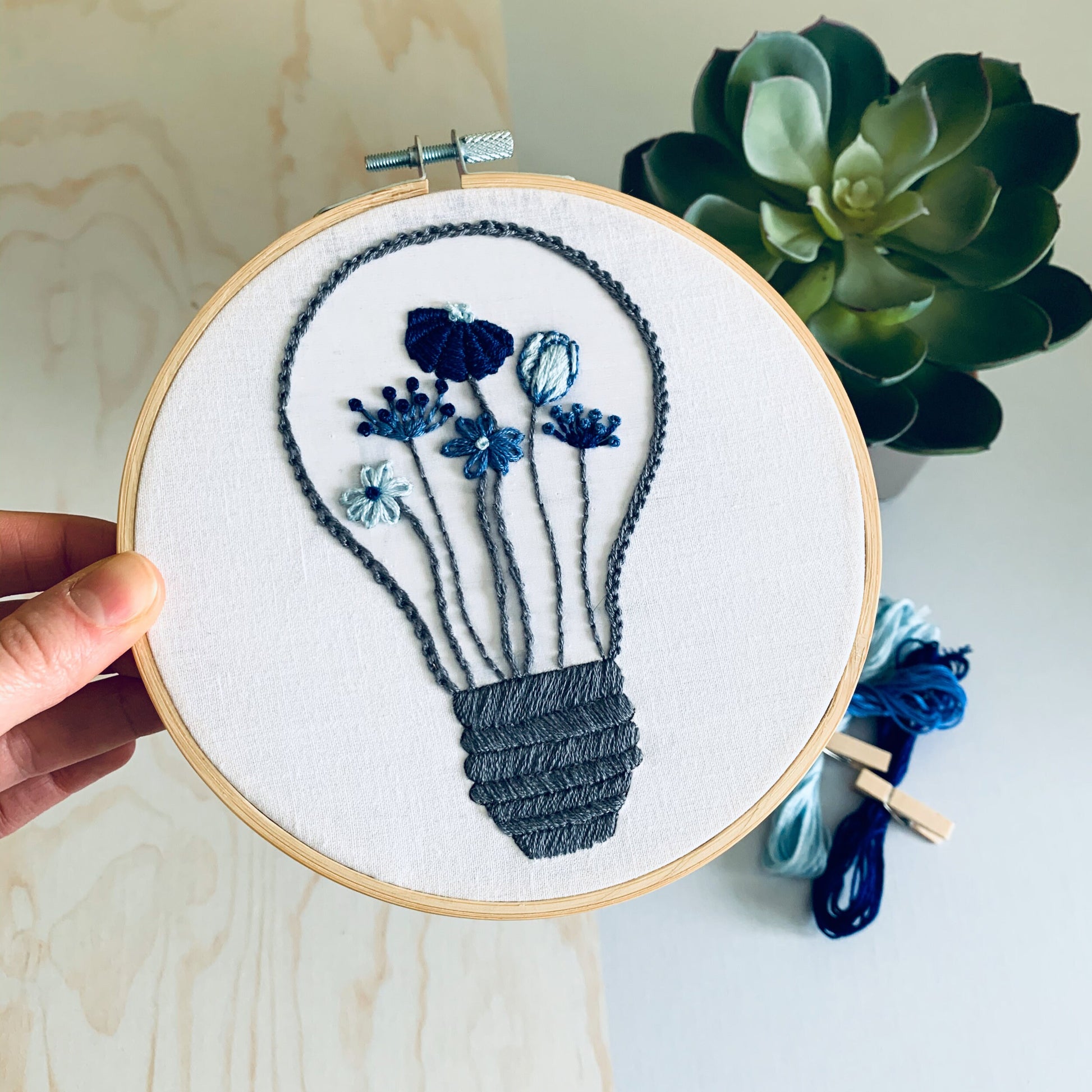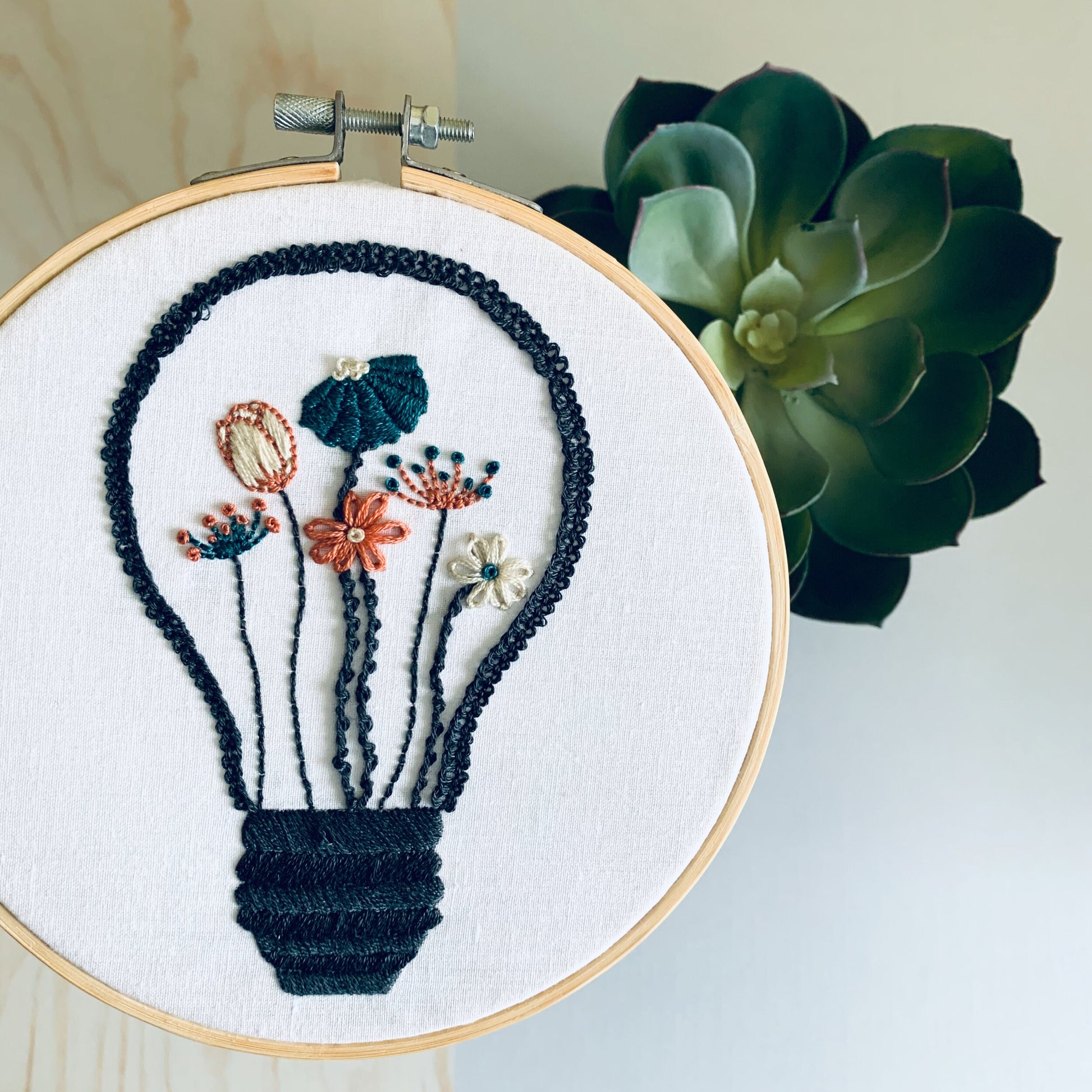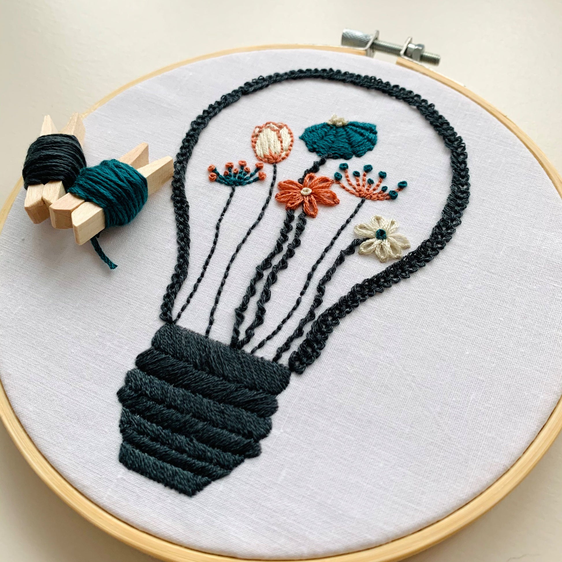 Full embroidery kit. Lightbulb floral hoop art. Beginner mindful sewing project