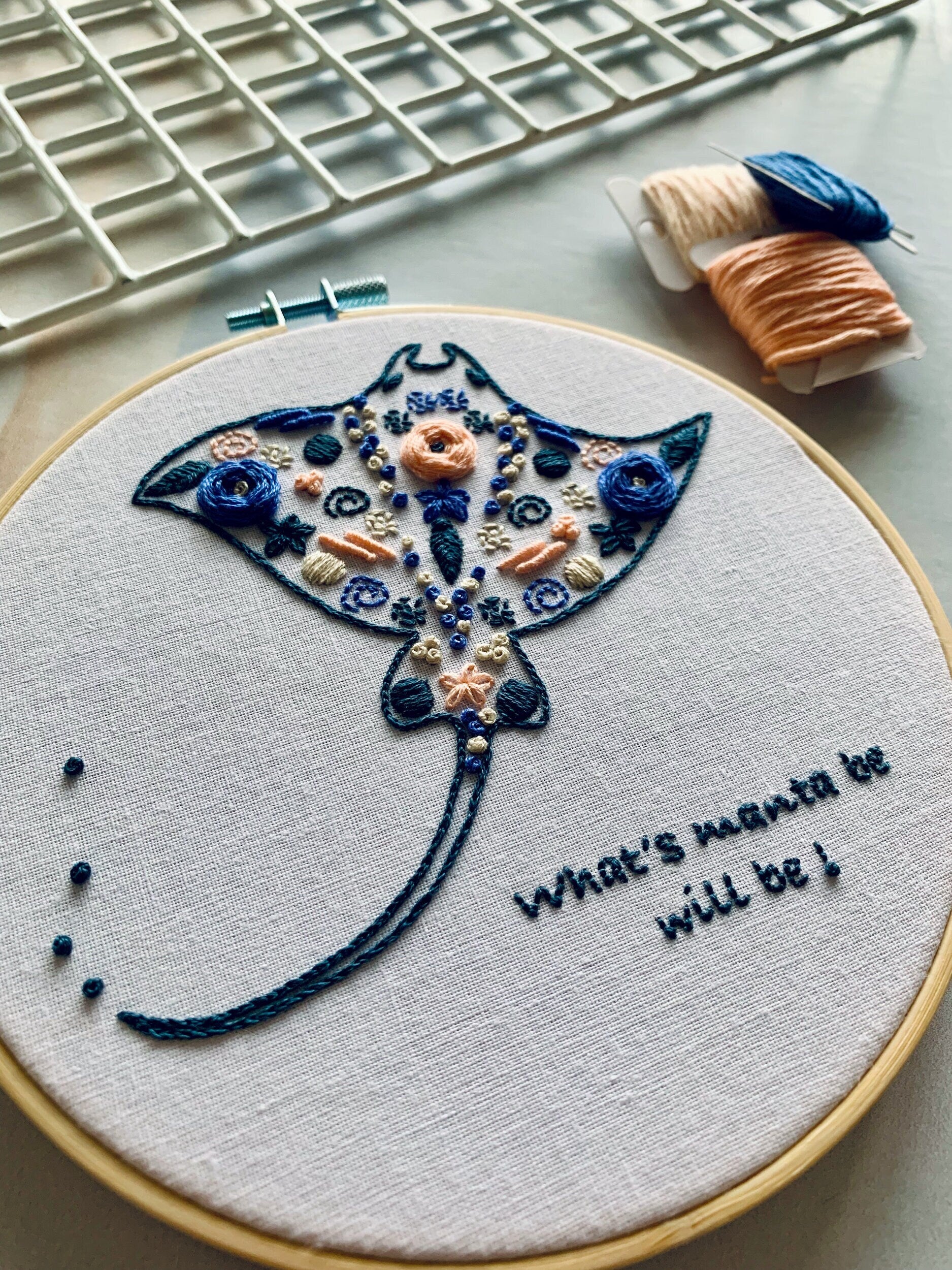 Full embroidery kit. Manta ray hoop art. Full DIY sewing project for mindfulness. Sting ray, sea-life craft