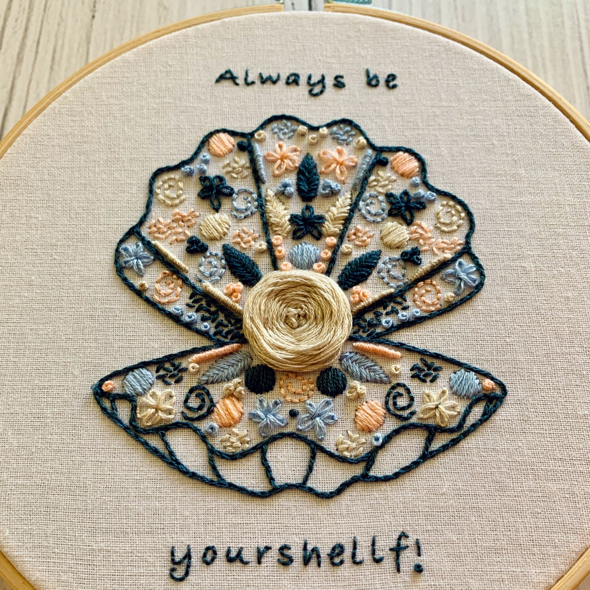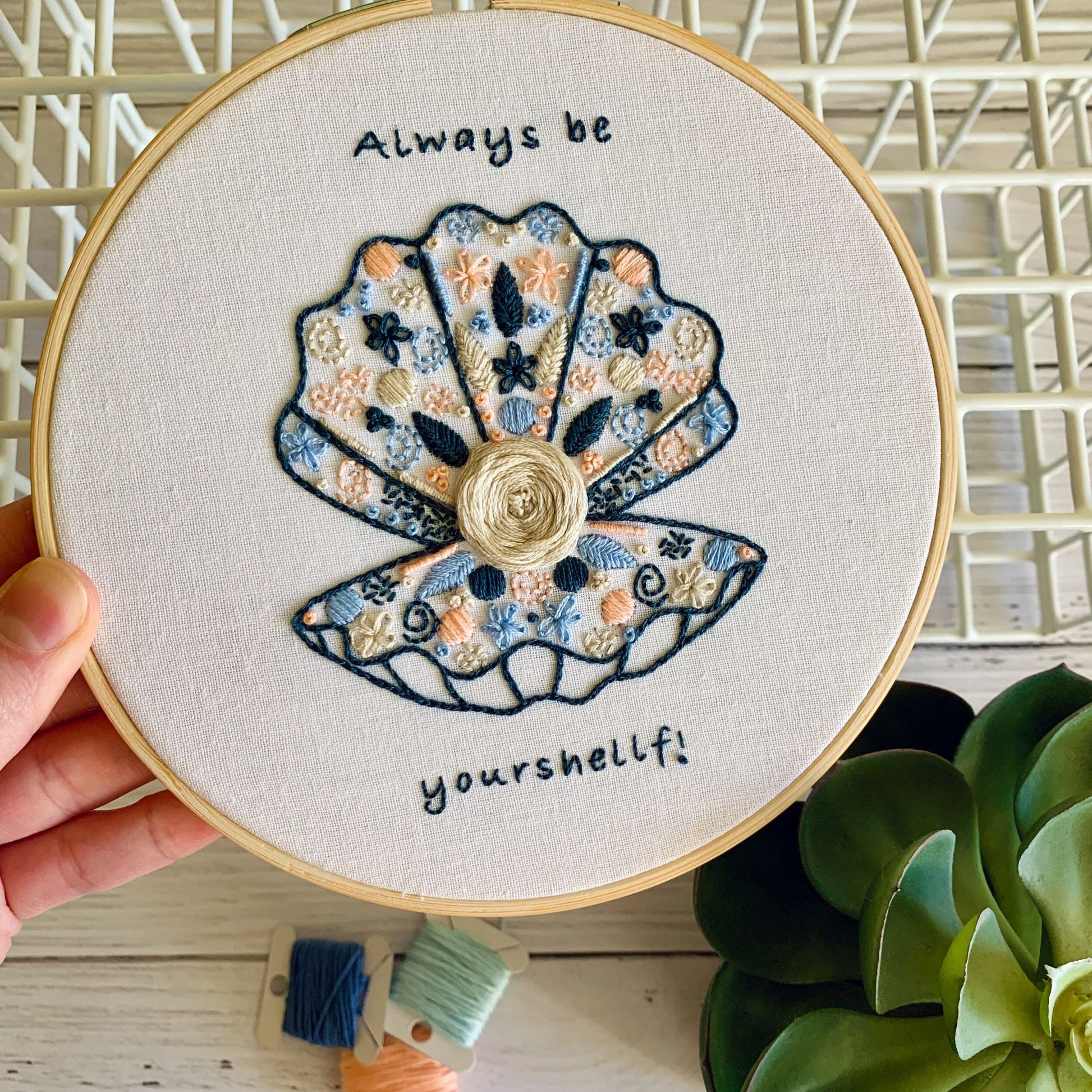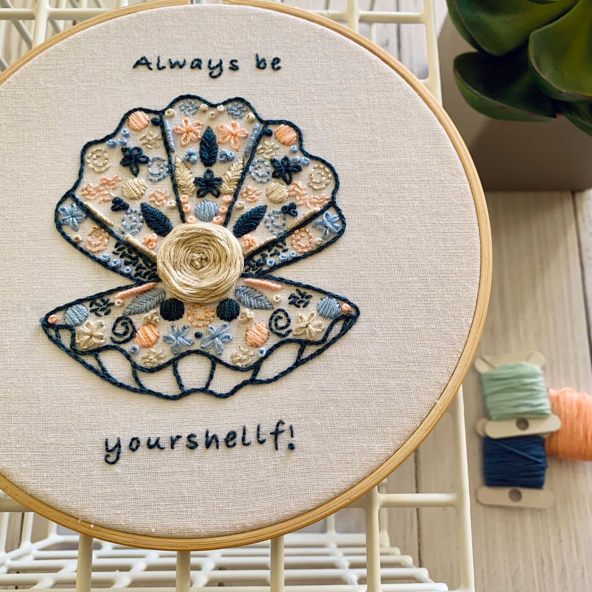 Full embroidery kit. Shell and pearl hoop art. Full DIY sewing project for mindfulness. Oyster clam, sea-life craft