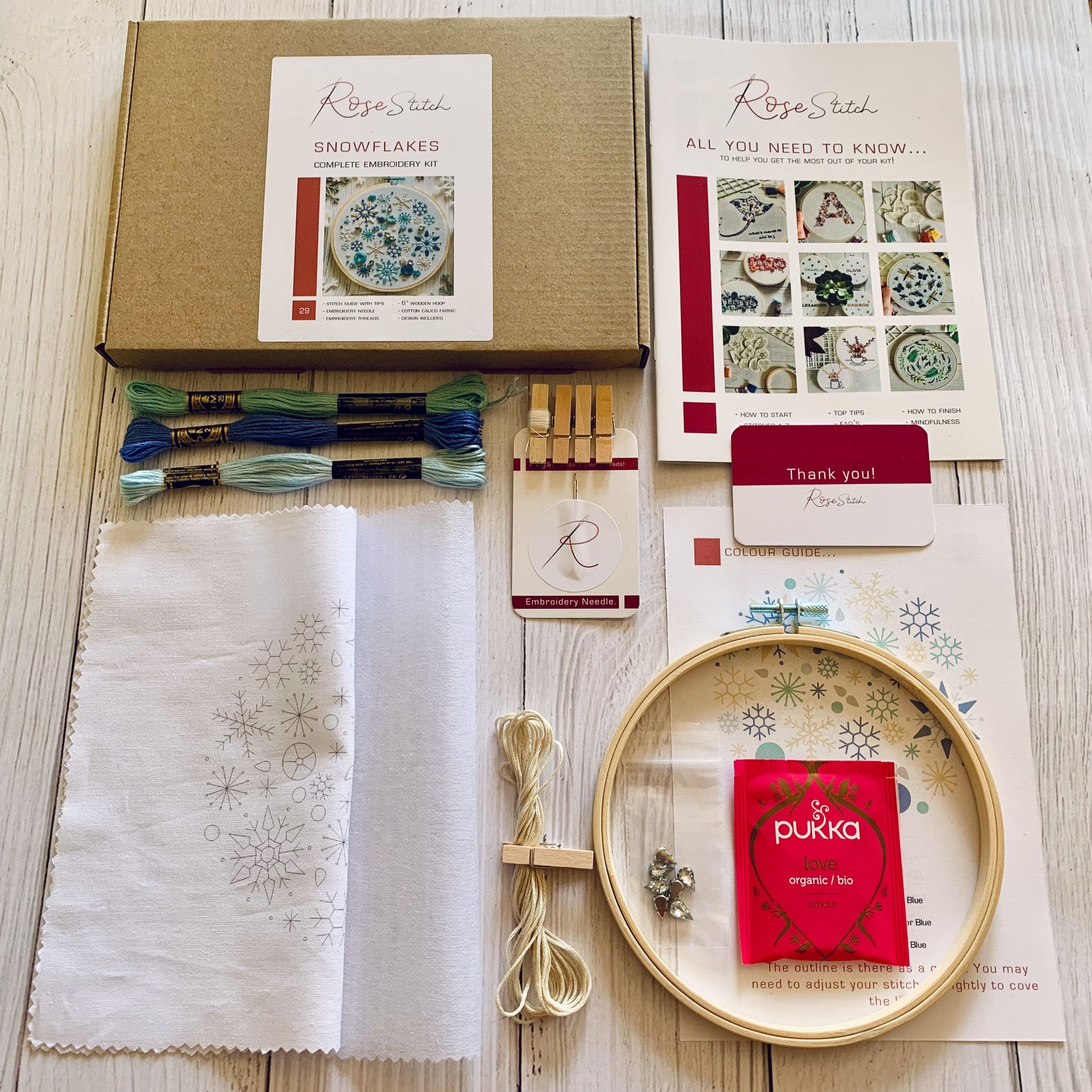 - Coloured cotton DMC threads with wooden pegs to help store