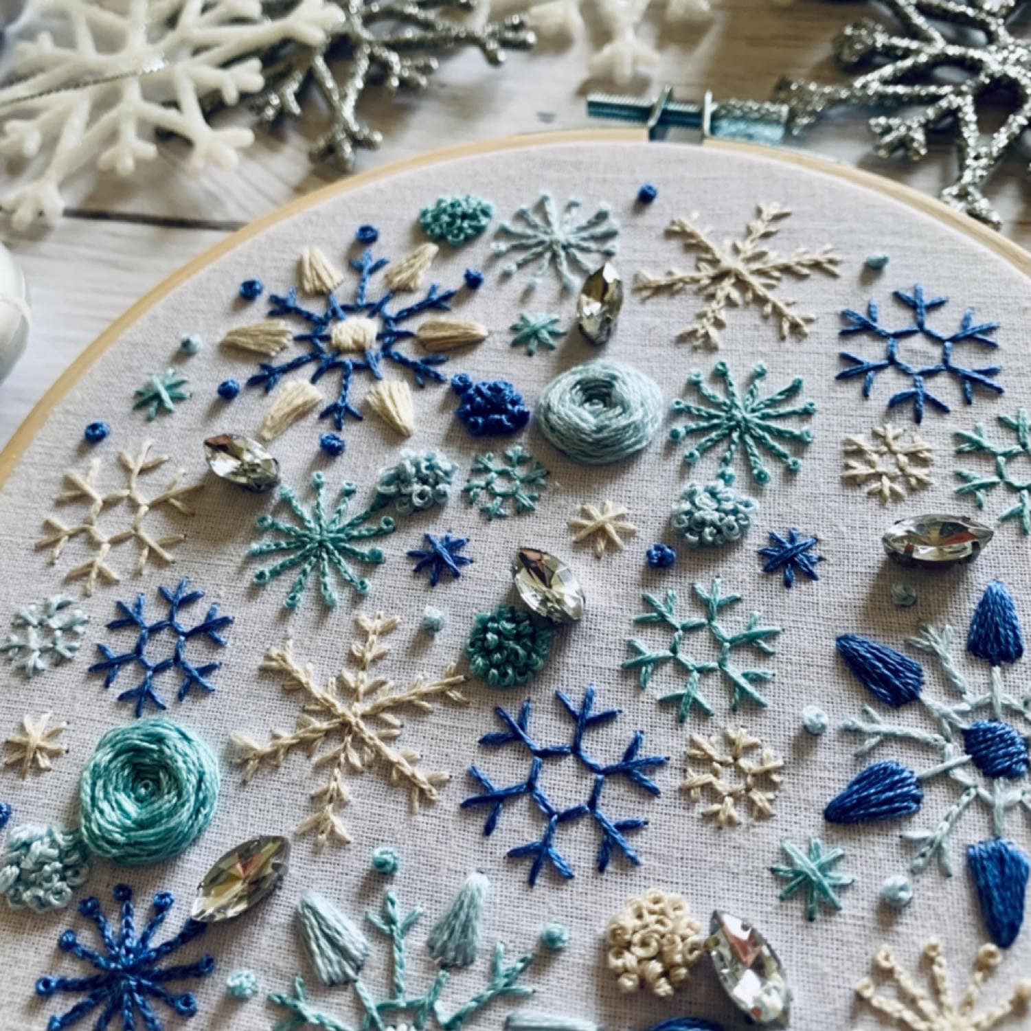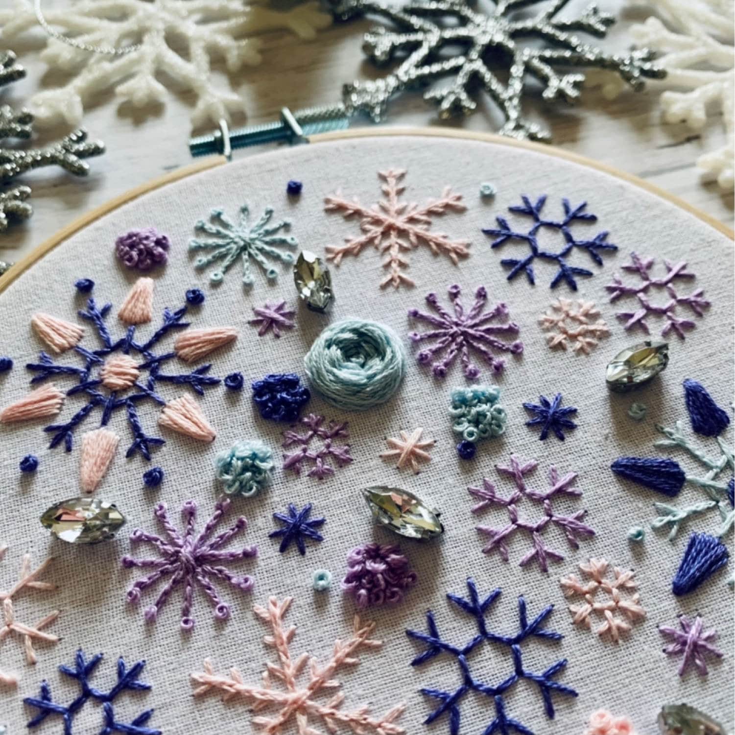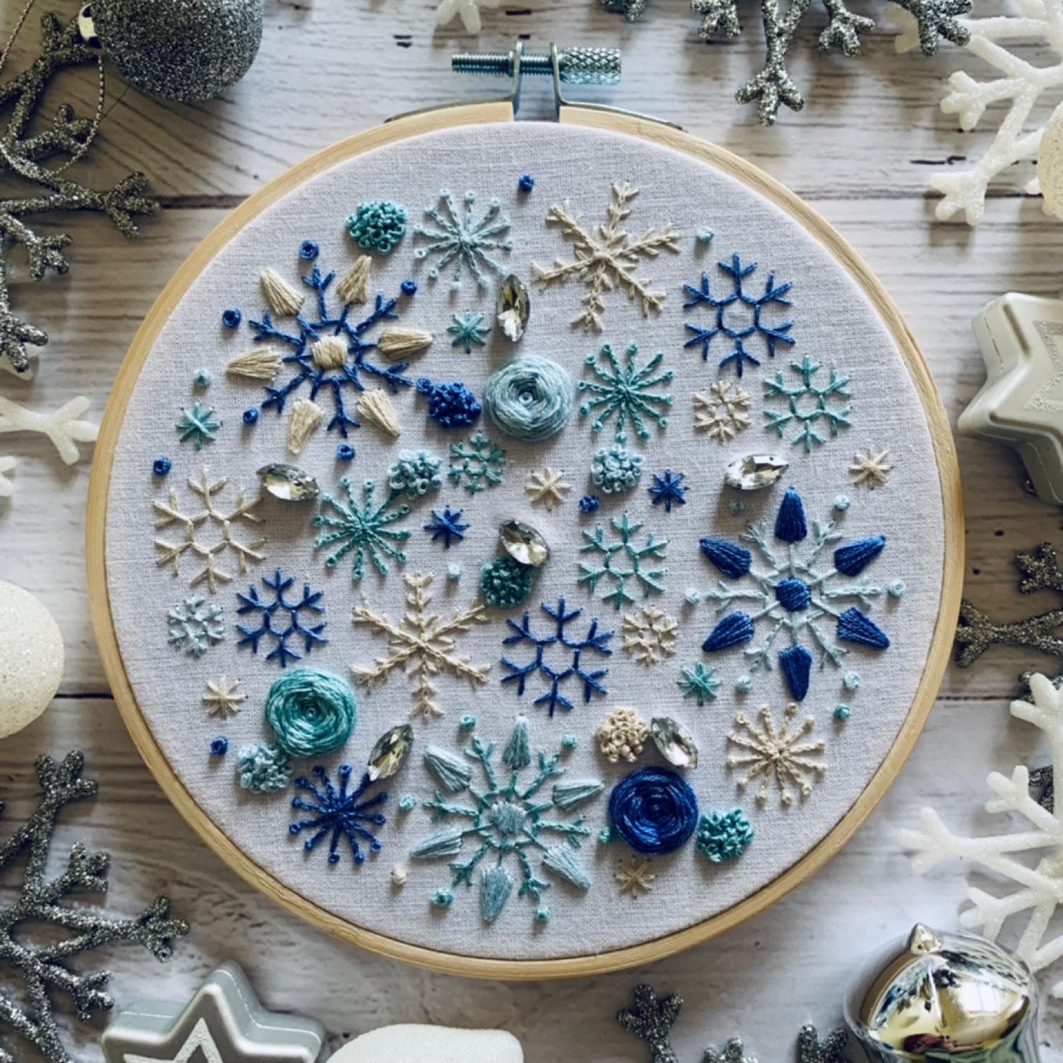 Full embroidery kit. Snowflake DIY modern hoop art. Creative winter craft gift for adult mindfulness.