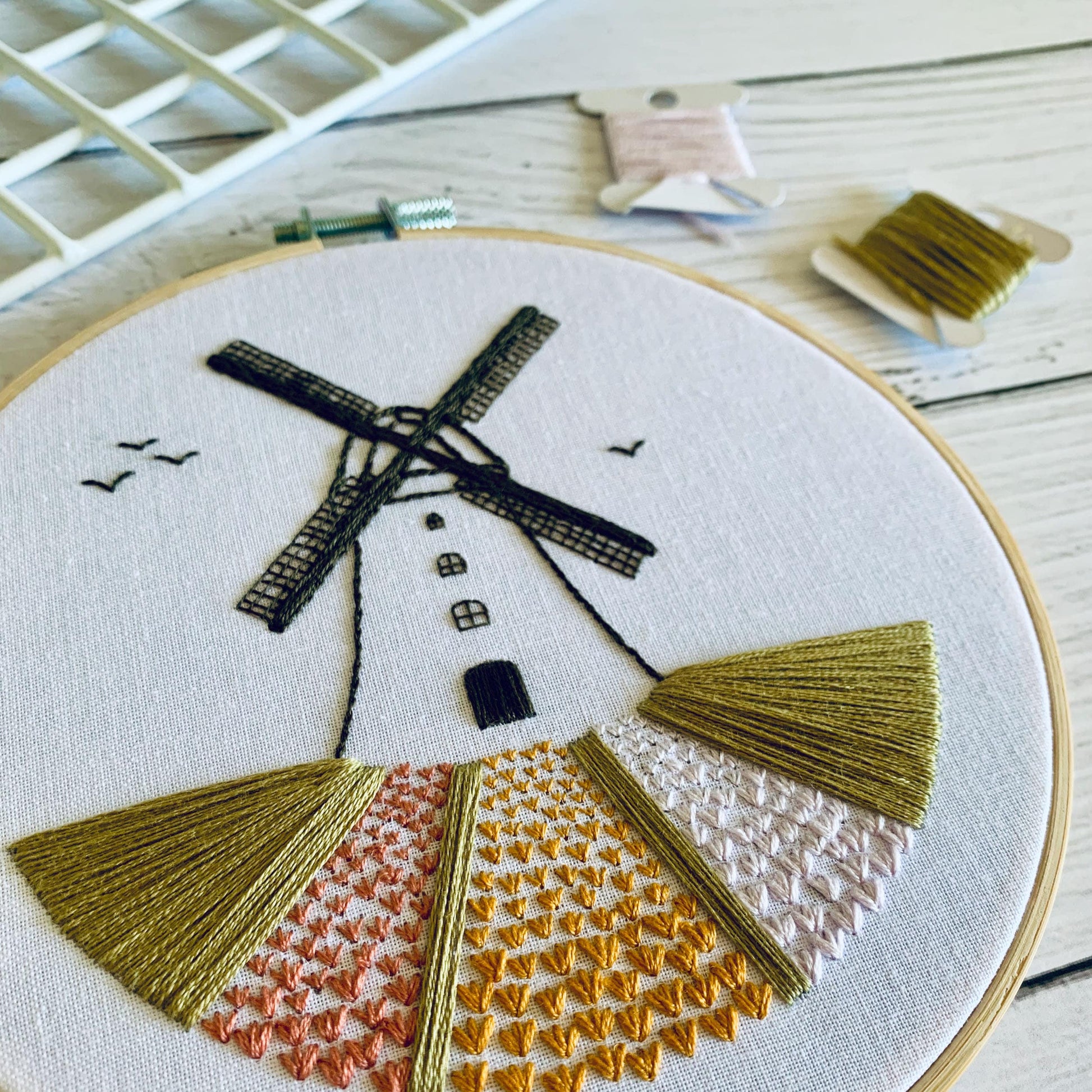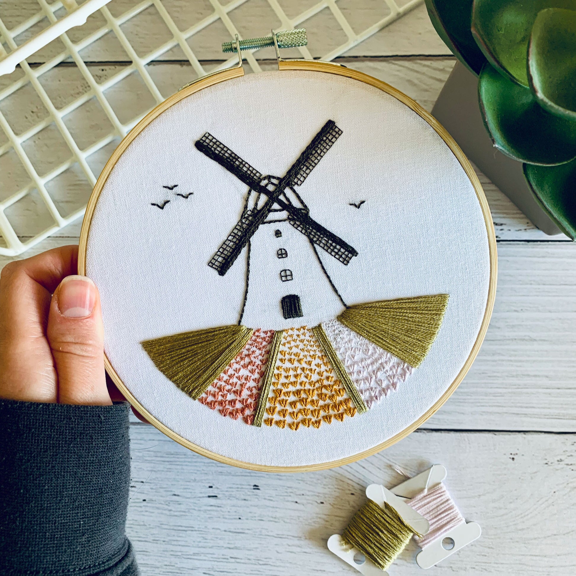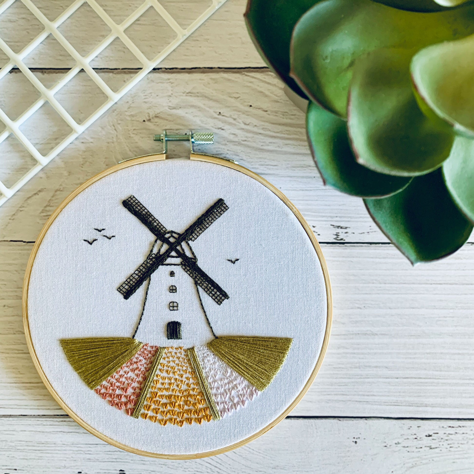 Full embroidery kit. Windmill and flowers DIY beginner hoop art craft. Adult anxiety/stress relief holland dutch tulip fields gift