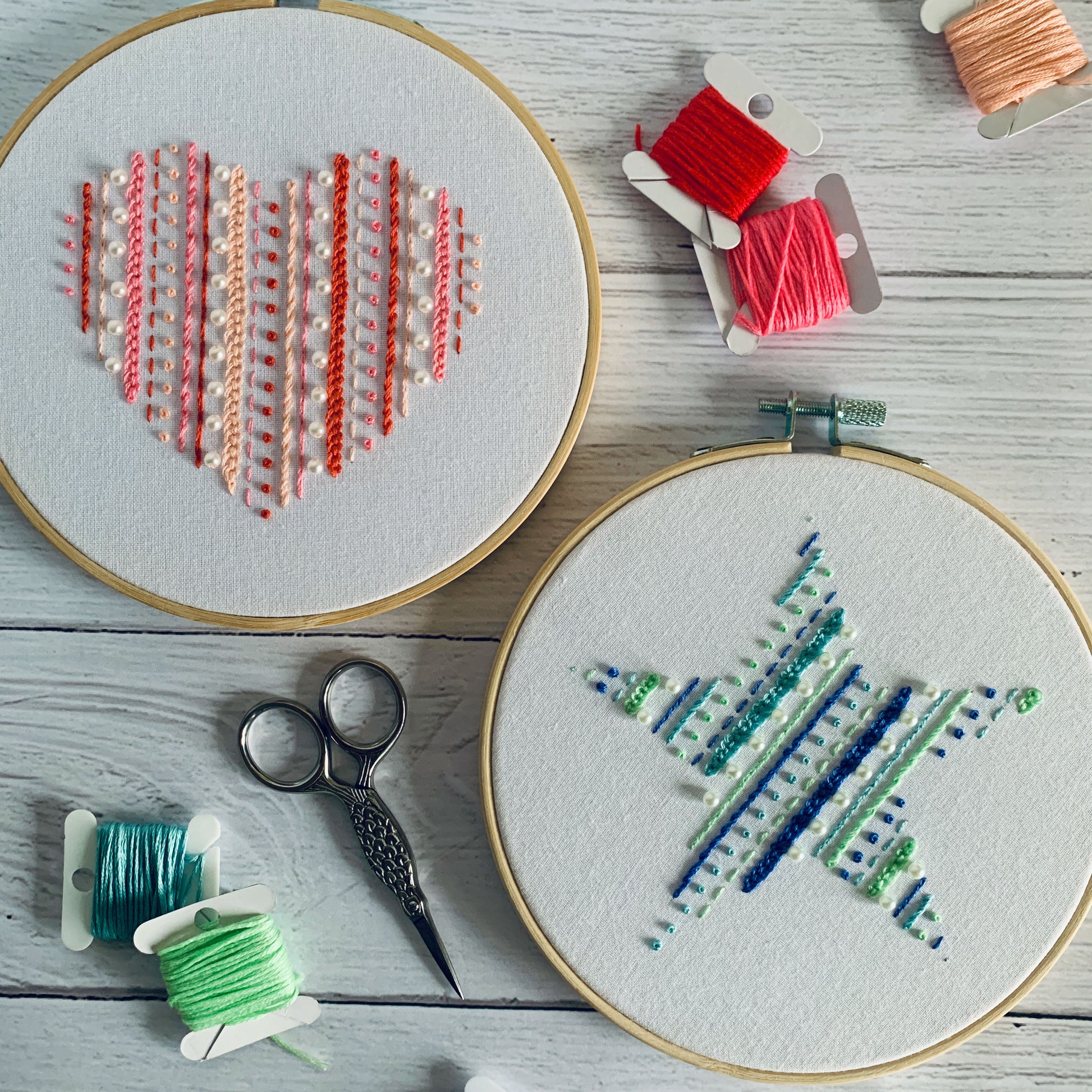 Digital download. Geometric embroidery hoop art PDF pattern with instructions. Star or heart with pearl beads.