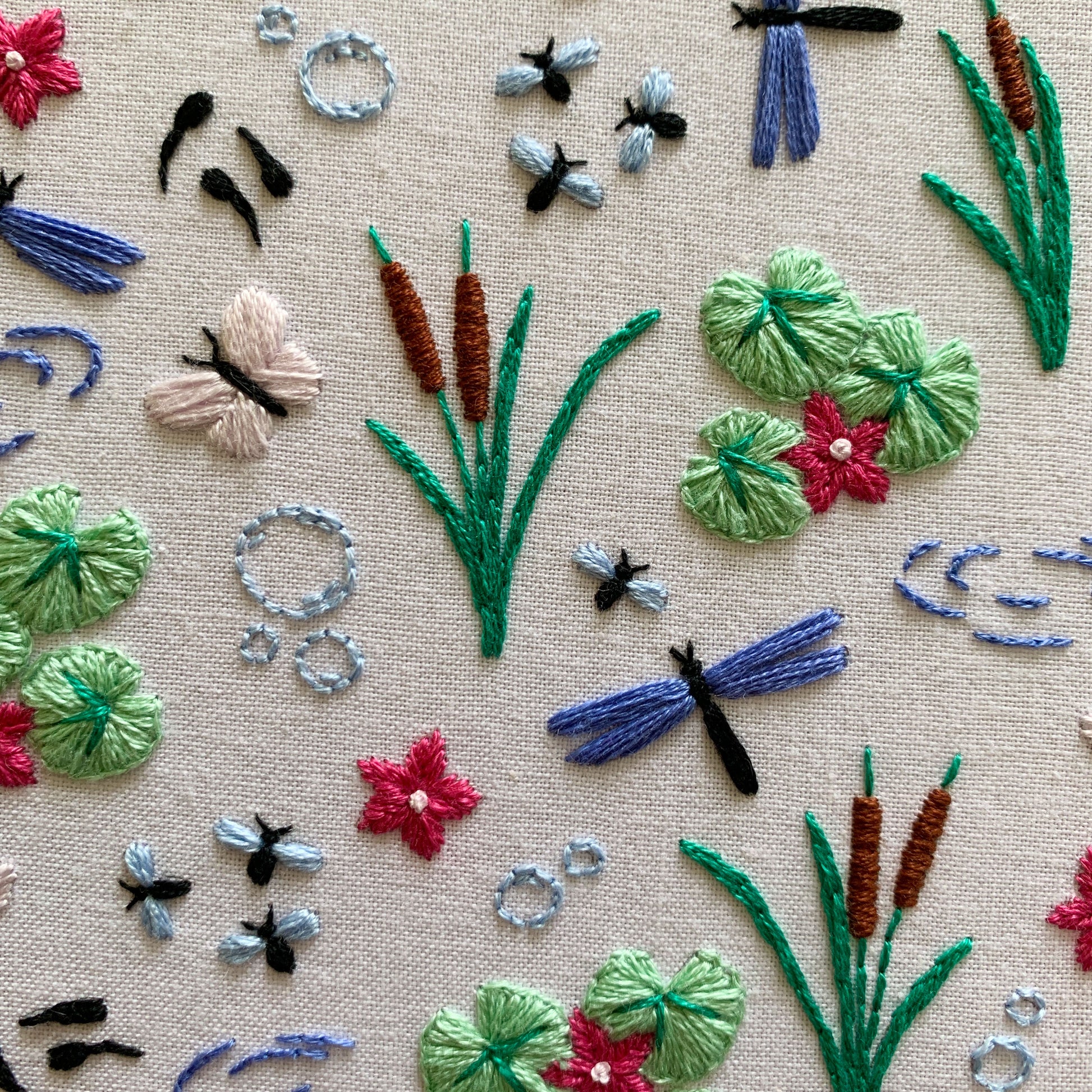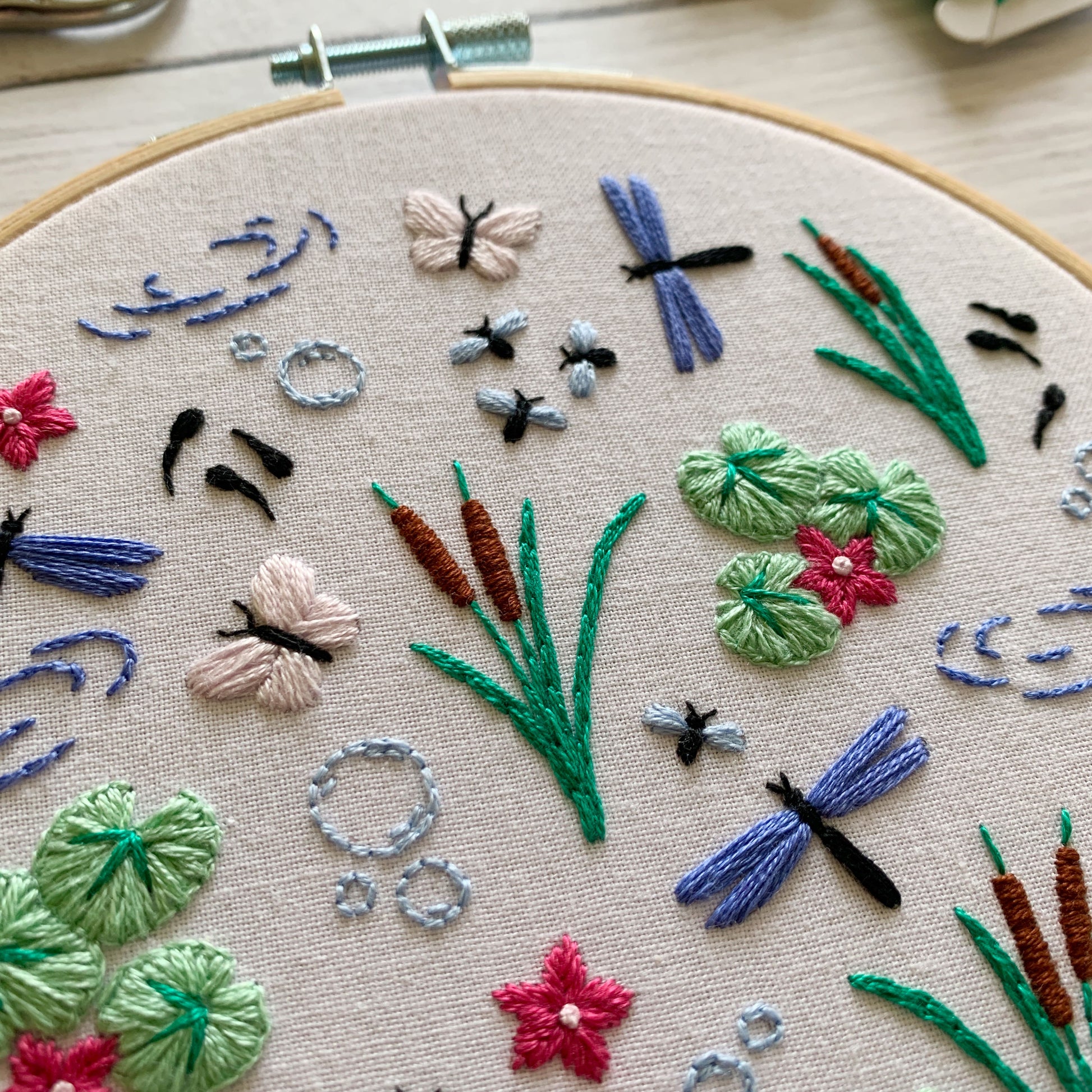 Pond Life Embroidery Kit - DIY Beginner Craft for Relaxation and Mindfulness. Spring dragonfly Hand Sewing Pattern
